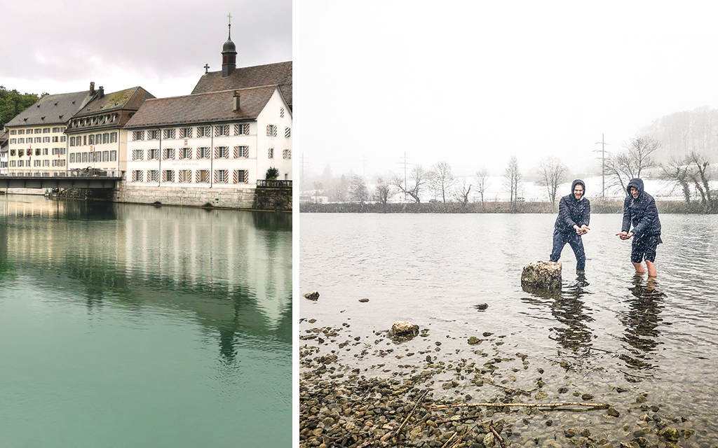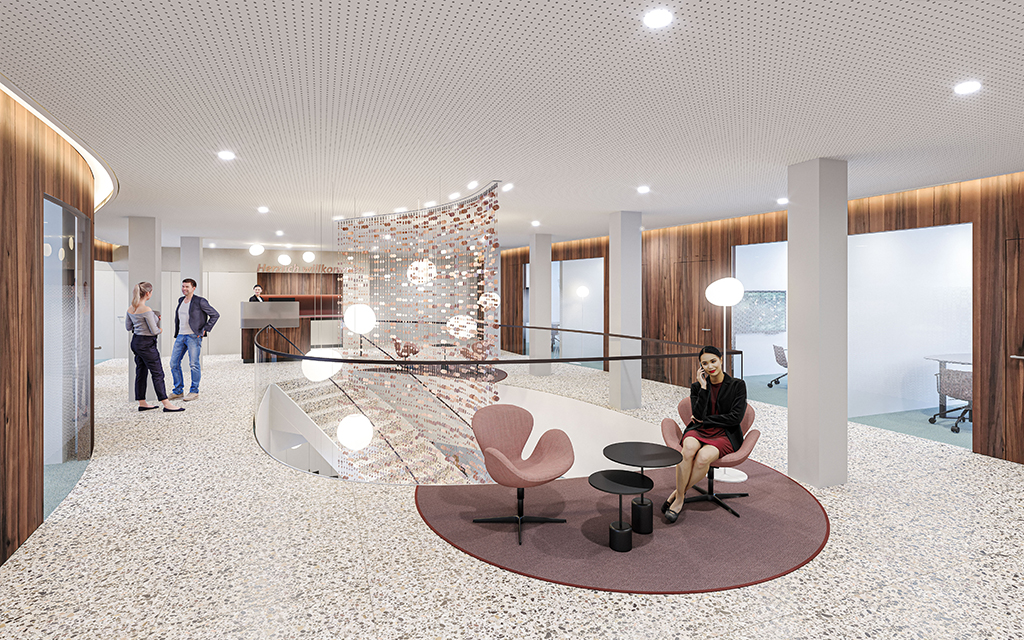 Bald schon fliesst ein neuer Aare-Seitenarm entlang der Büroräumlichkeiten und mitten durch die Kundenberatungszone im ersten Obergeschoss, bevor sich das Wasser in einem Tröpfchenwasserfall durch die grosszügige, neue Treppenöffnung ins Erdgeschoss ergiesst.