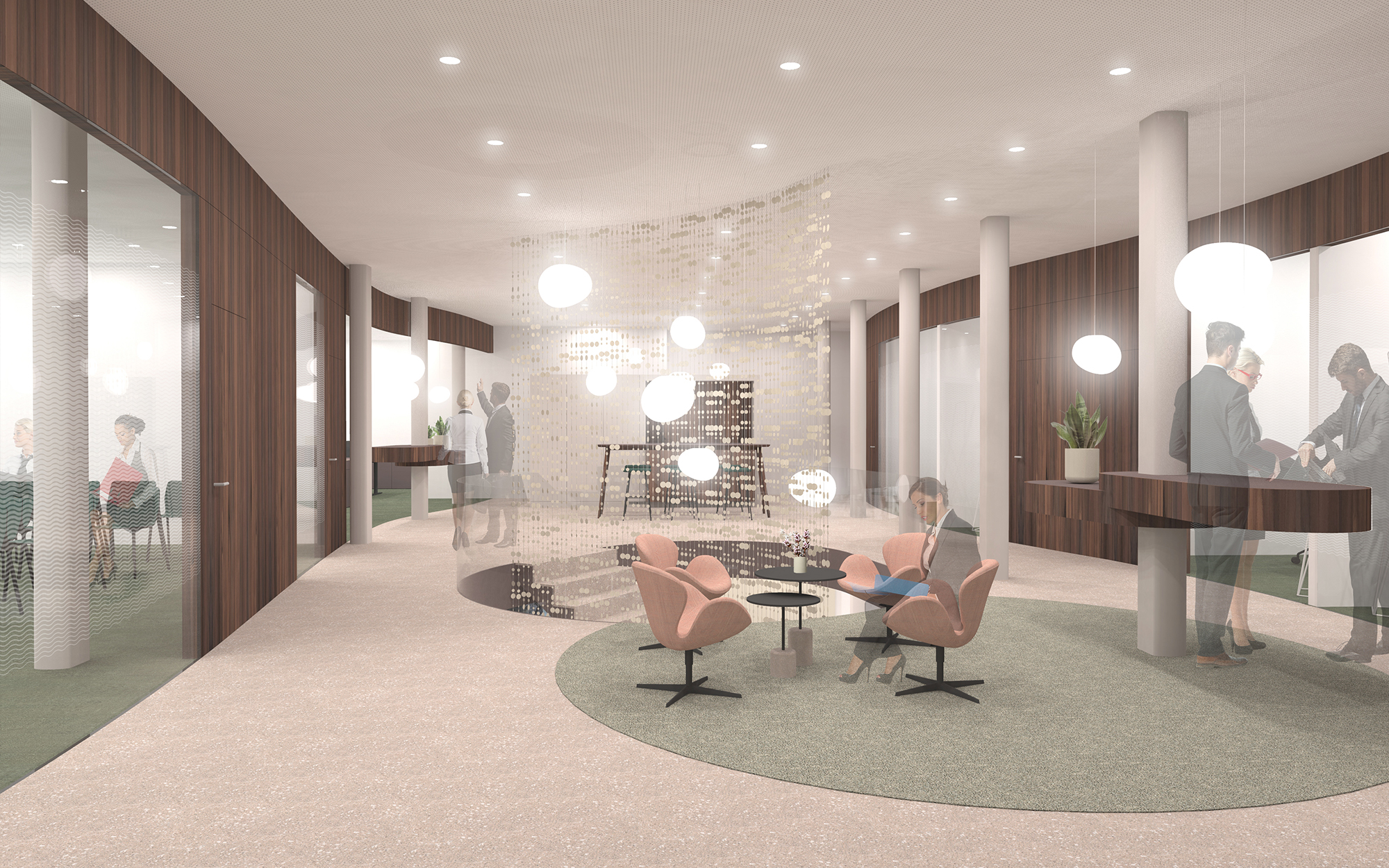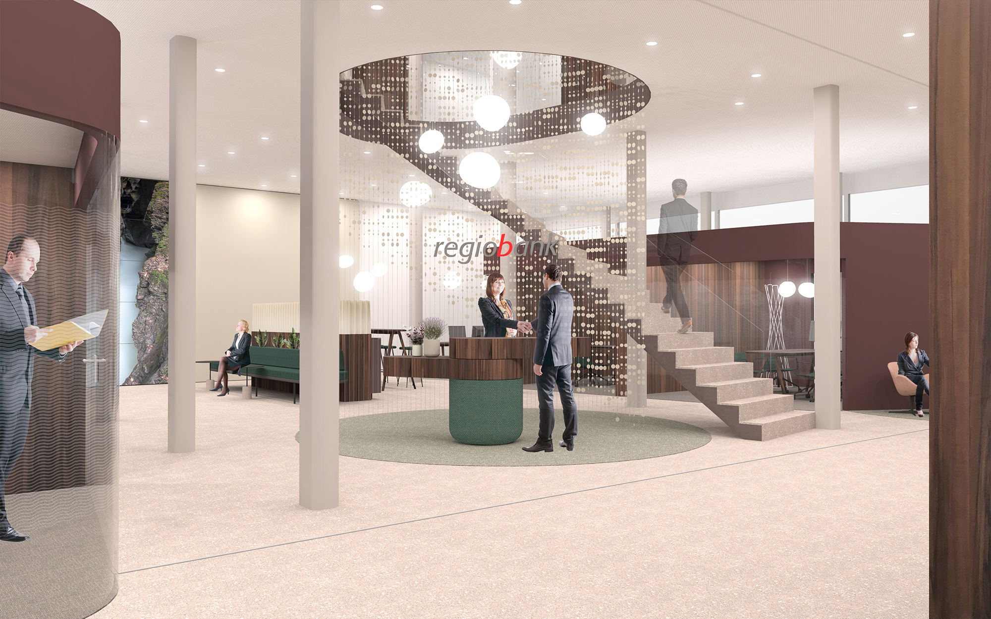 We are delighted to have been entrusted with this challenge and to be developing it together with our architecture and GP partners, Graf Stampfli Jenni Architects and Studer Gebäudetechnik. Our planning team held its own against two other strong teams with its «Im Fluss» concept. Our remit includes the interior design of the customer zone as well as the redesign of the new work spaces with a total of 110 workplaces spread over five floors. This is the most extensive project assigned to Gehri since we set up the Planning and Concept Department in 2008 and it draws upon our experience and expertise in organisation, design and three-dimensional brand identity.