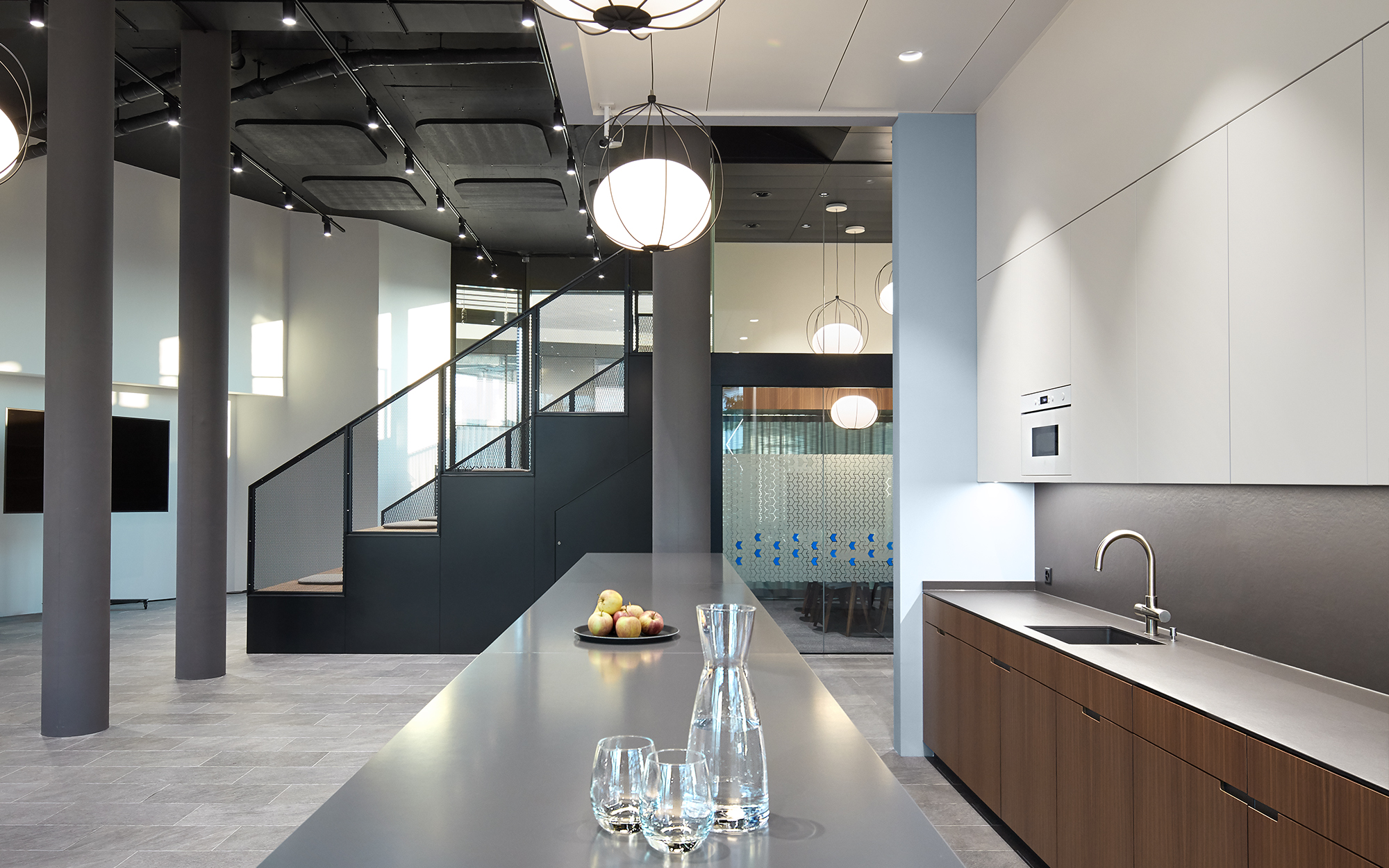 The 5.2 m high rooms are supplemented with two built-in volumes, which create an extraordinary room dramaturgy — the gallery and meeting rooms extend over the entire height of the room and let you experience the dimension of the space.
