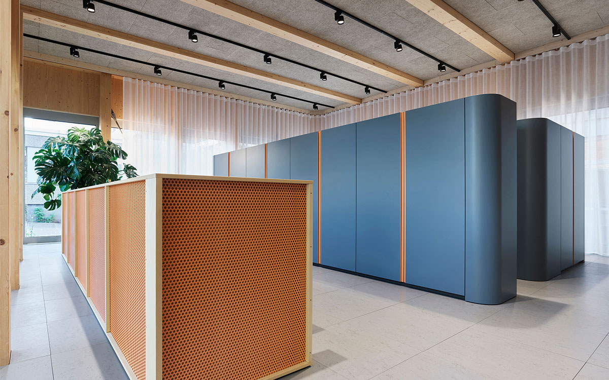 The pavilion is divided into two areas: a modern office area with new working environments and a retail area for customers. The office area is characterised by an open and flexible working environment that offers employees a bright, open and yet discreet working atmosphere.