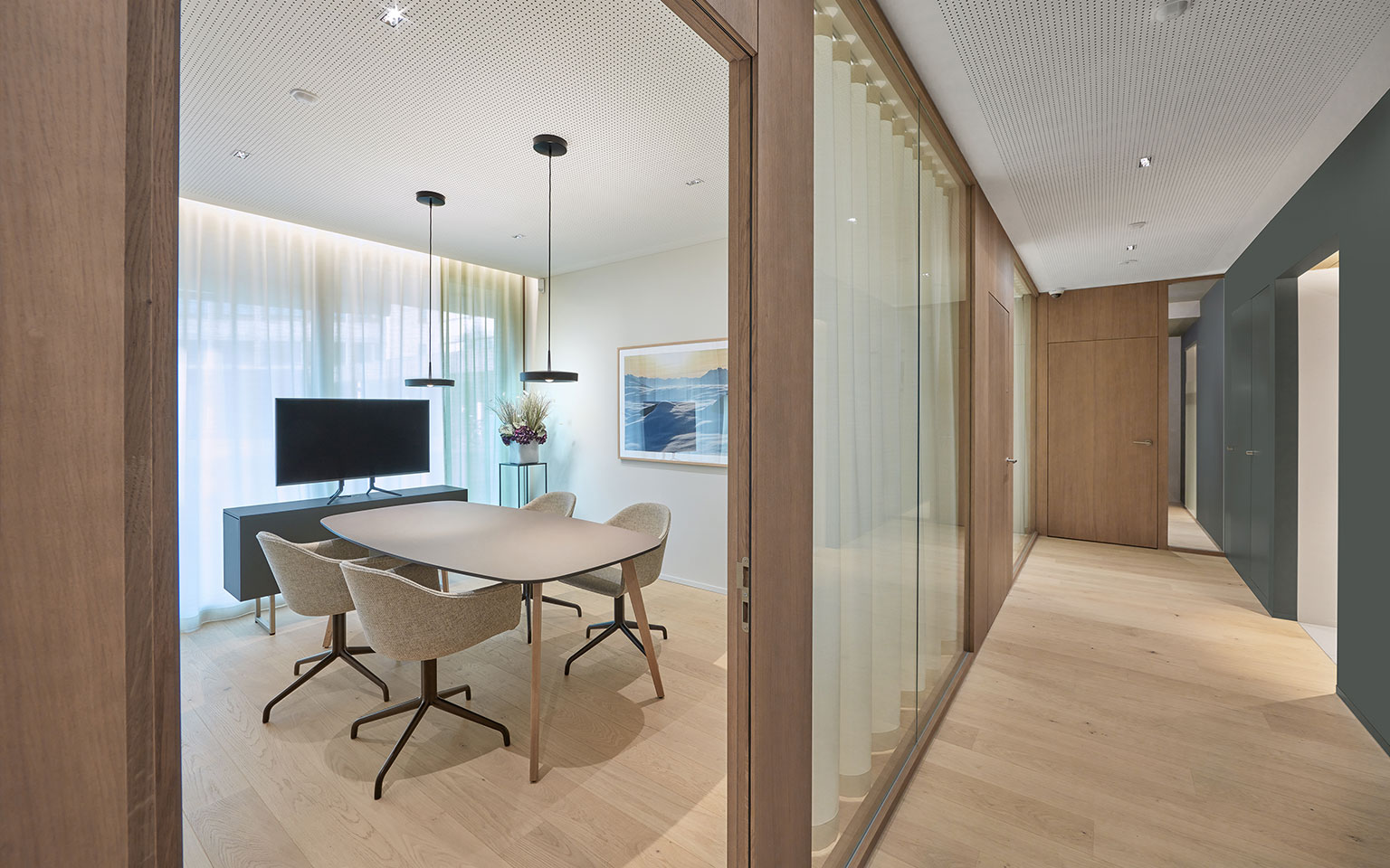 A defining element is the coffee area that connects the space and provides a setting for brief consultations over a cup of coffee. The adjoining room is used for informal consultations and simultaneously enables customer events to be hosted.