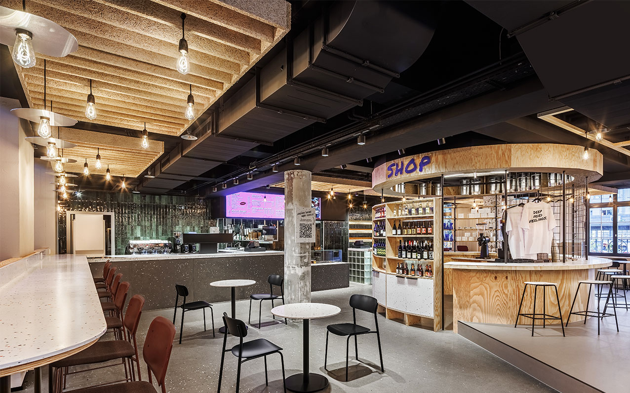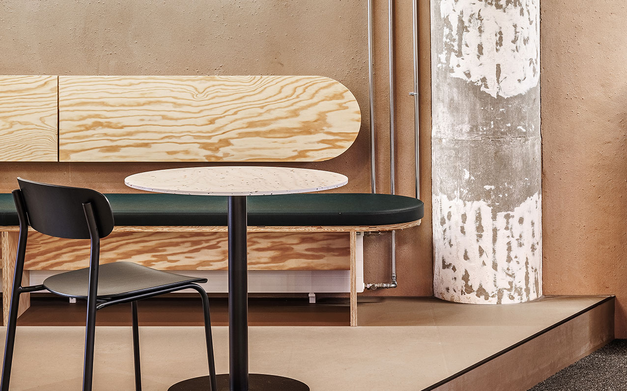 The design is urban, raw and vibrant — shaped by recycled materials, deliberately without heavy refinement. This created a place with character, making the idea of circular economy tangible in spatial form.