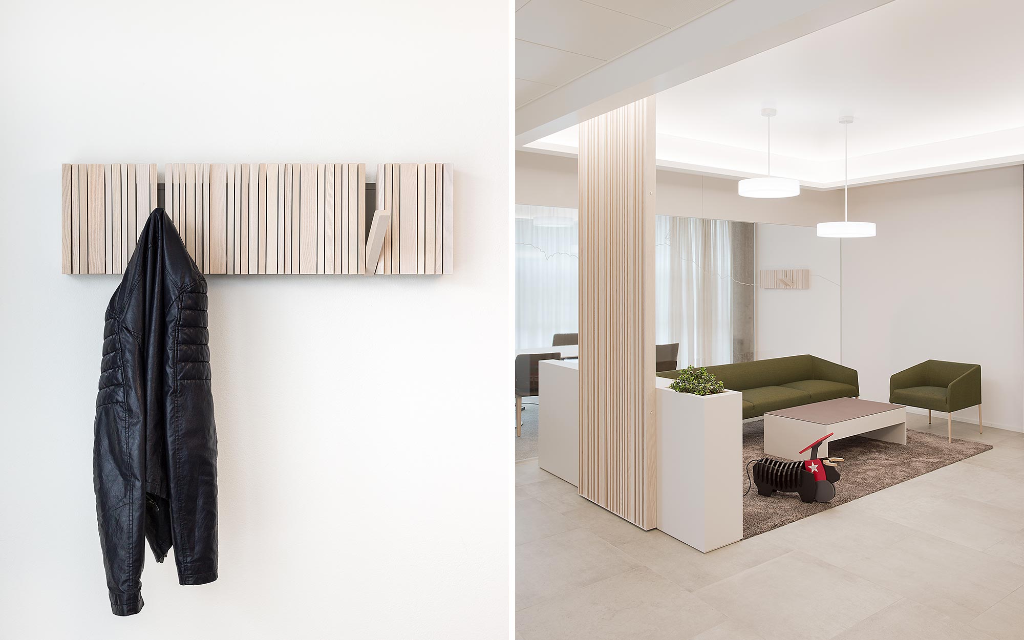 After developing and agreeing on the spatial concept, we then set about producing the partition walls (some of which are sound-proofed) and the furniture for the reception, the waiting area and the offices.