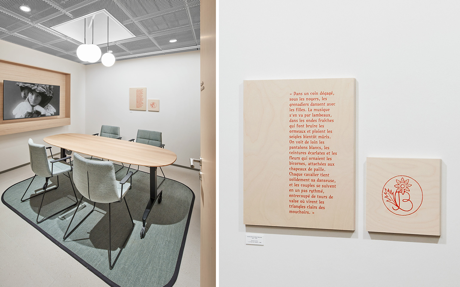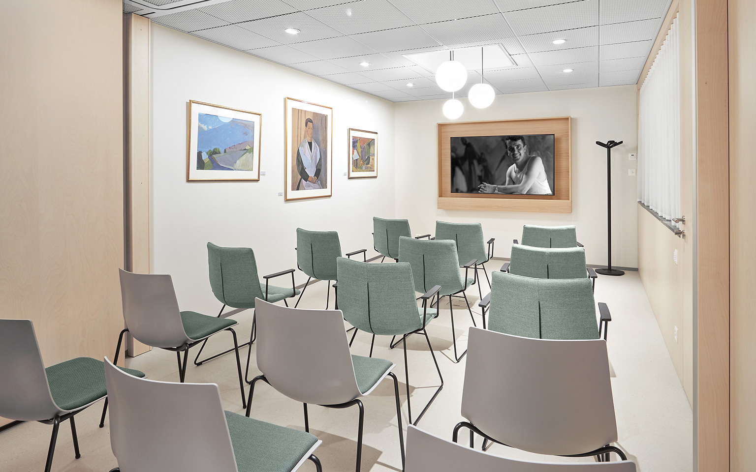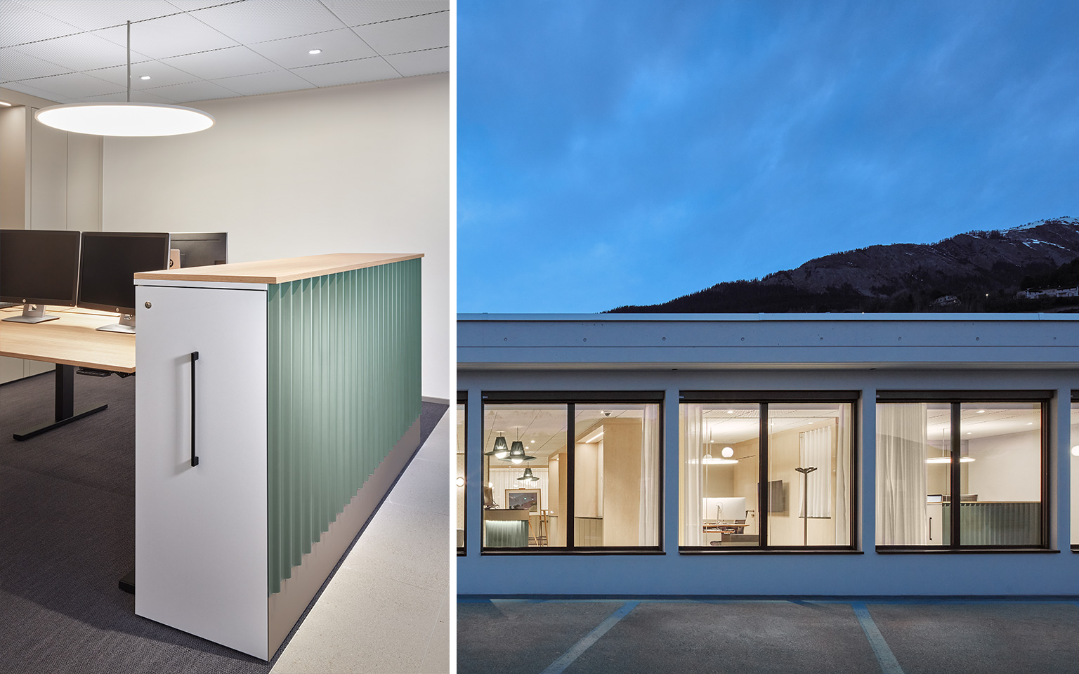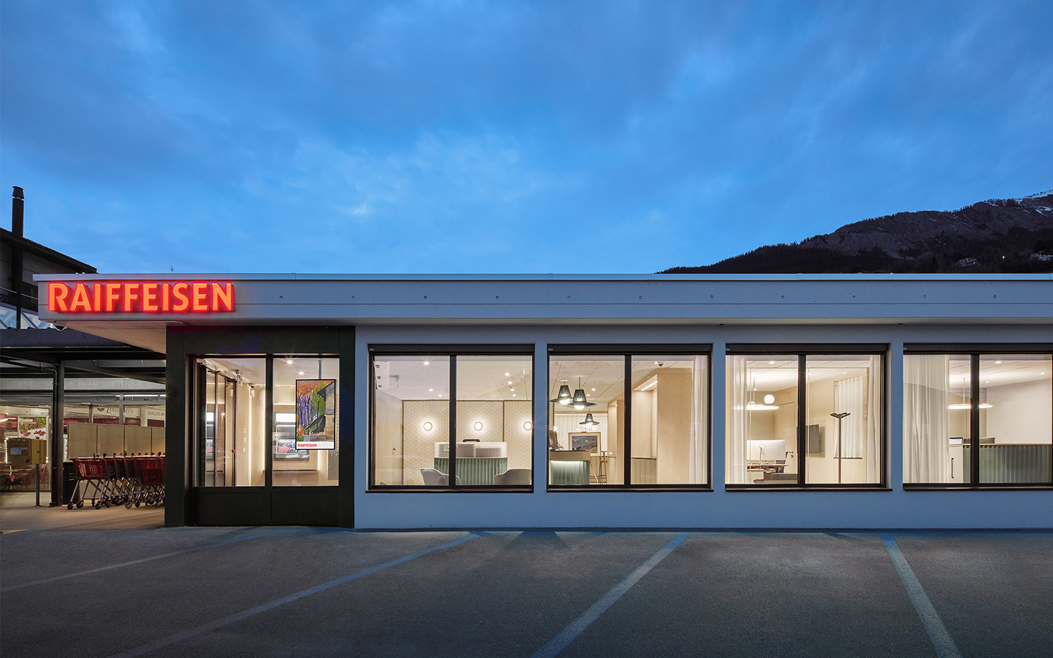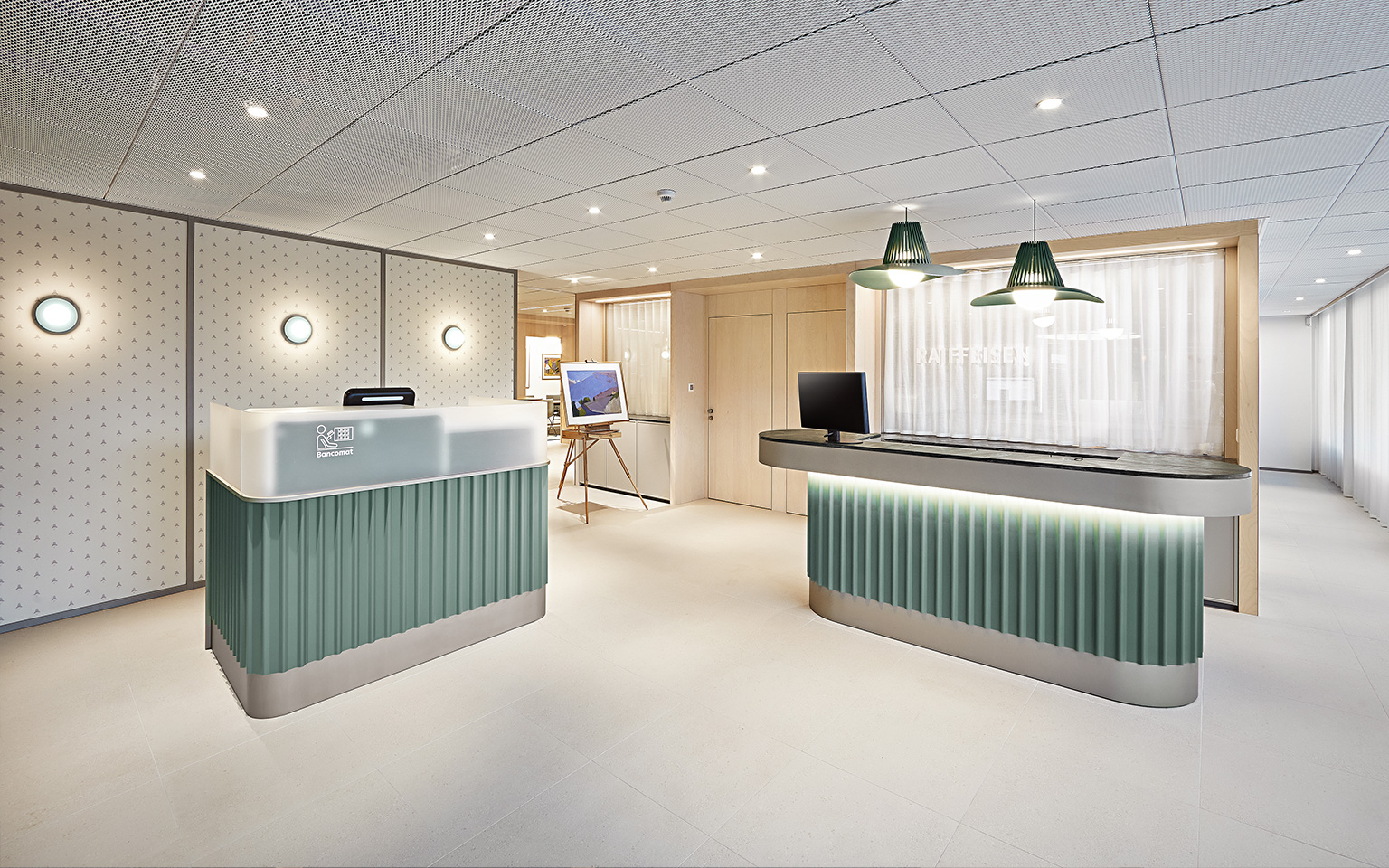 Lors de la rénovation totale, la Banque Raiffeisen de Savièse a saisi l’occasion d’agrandir et de réorganiser ses espaces. Et ainsi de laisser transparaître l’histoire culturelle locale au cœur de ses espaces clientèle. Le renouvellement de la technique du bâtiment, y compris l’installation de panneaux photovoltaïques ainsi que les nouvelles ouvertures en toiture permettent de bénéficier de la lumière du jour et d’un refroidissement la nuit, et assurent ainsi un confort optimal pour les clients et les collaborateurs. Le guichet blindé a fait place à un espace ouvert qui offre différentes possibilités de travail et de conseil. La banque dispose de deux espaces sécurisés de manière distincte, ce qui permet d’utiliser l’un d’eux pour des événements externes avec l’infrastructure nécessaire.