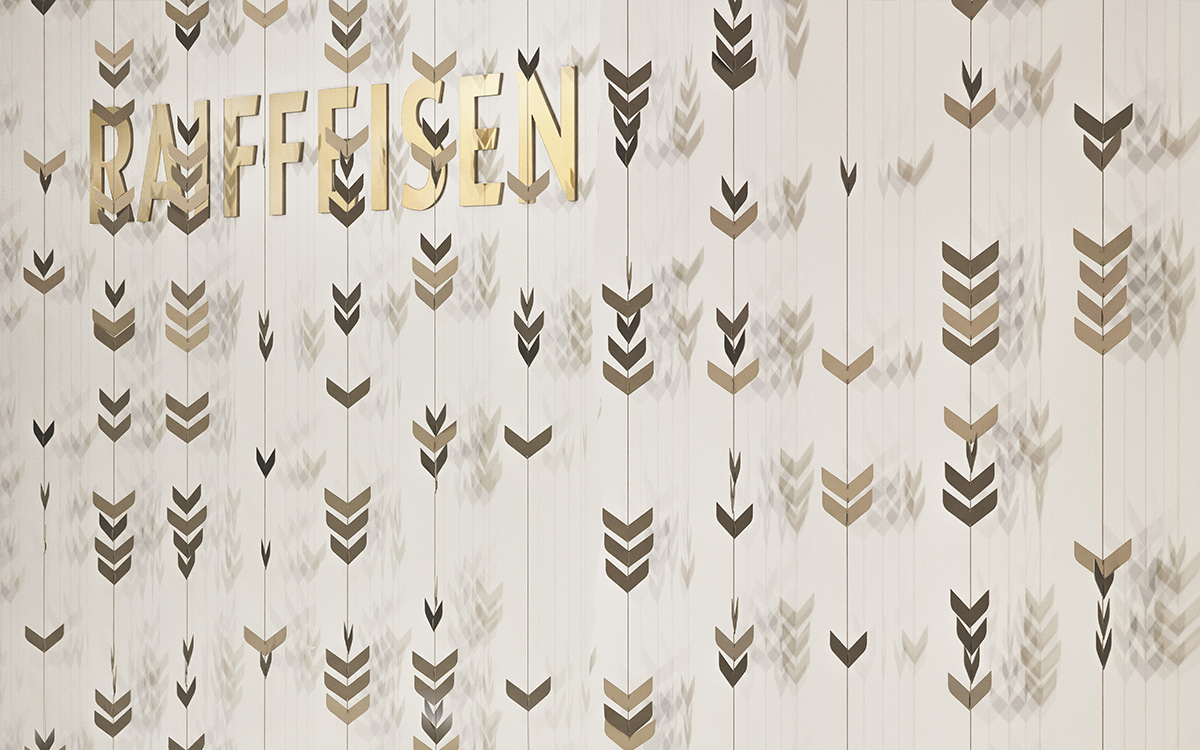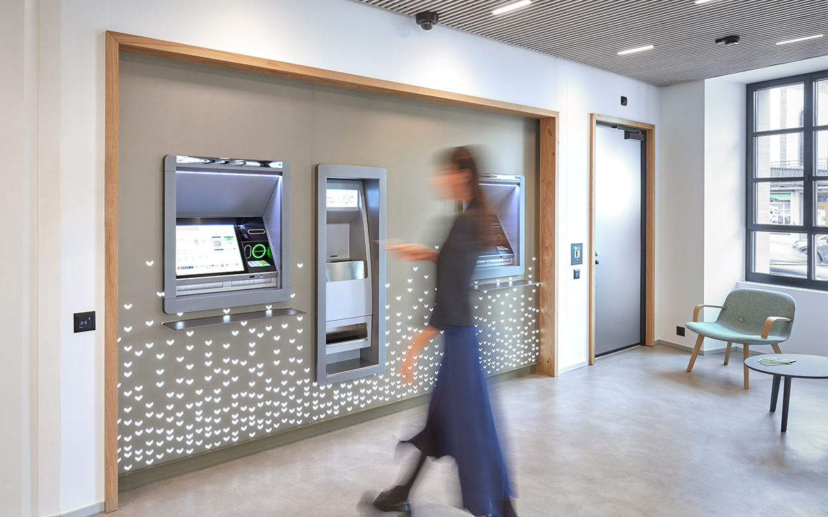 L’épi de blé, tel un symbole régional, devient un élément graphique et tridimensionnel pour le brandwall des espaces clientèle où, tout en délicatesse, les grains scintillent et vibrent suivant la lumière qui s’y dépose, provenant d’un système d’éclairage suspendu à plus de 6 mètres de hauteur sur mesure.