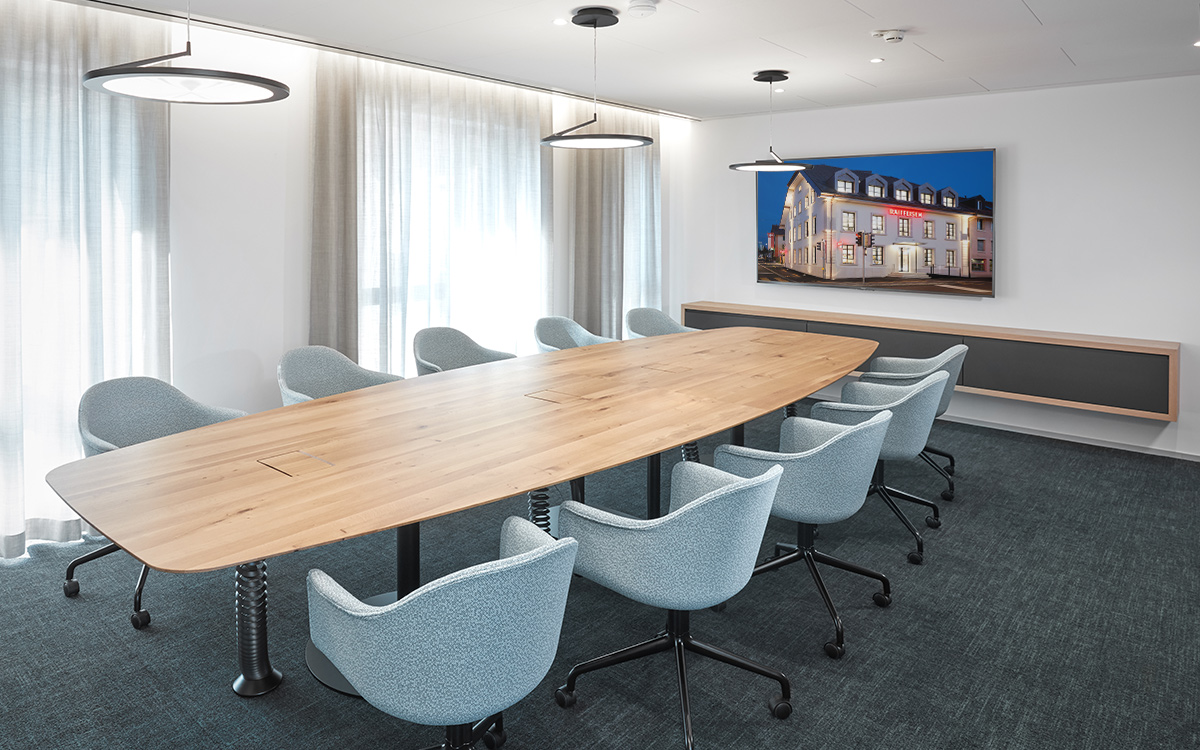 La vue aérienne des champs alentours avec leurs parcelles bien définies a inspiré notre concept de matérialisation du sol, sélectionnant différentes couleurs de moquette pour les salons de conseil qui se déclinent sur le choix des rideaux et des tissus créant ainsi un code couleur par pièce, telle une parcelle de blé ou d’orge, etc.