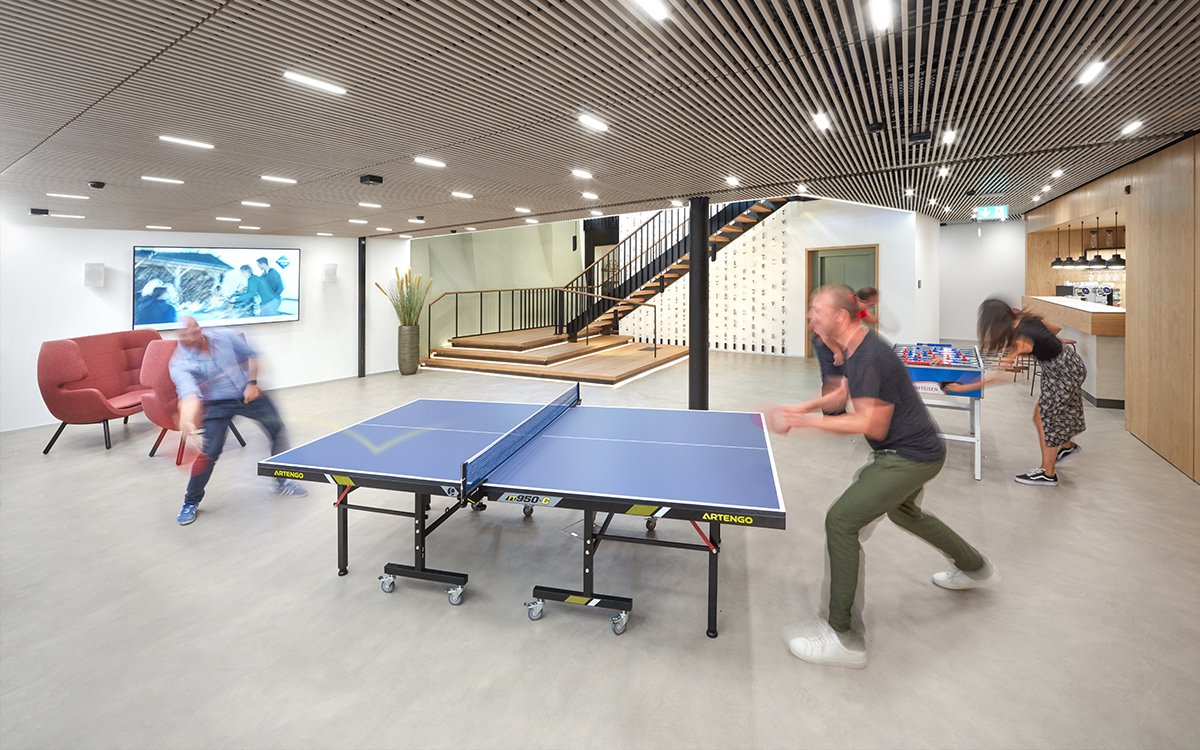 Les étages sont consacrés aux collaborateurs avec des espaces de réunion, une salle de conférence et une cafétéria.