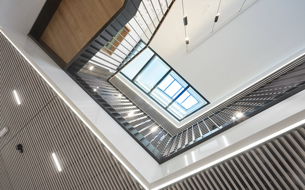 La lumière fut un thème prépondérant au concept avec la création d’un puits de lumière venant baigner l’ensemble des étages de sa lumière naturelle.
