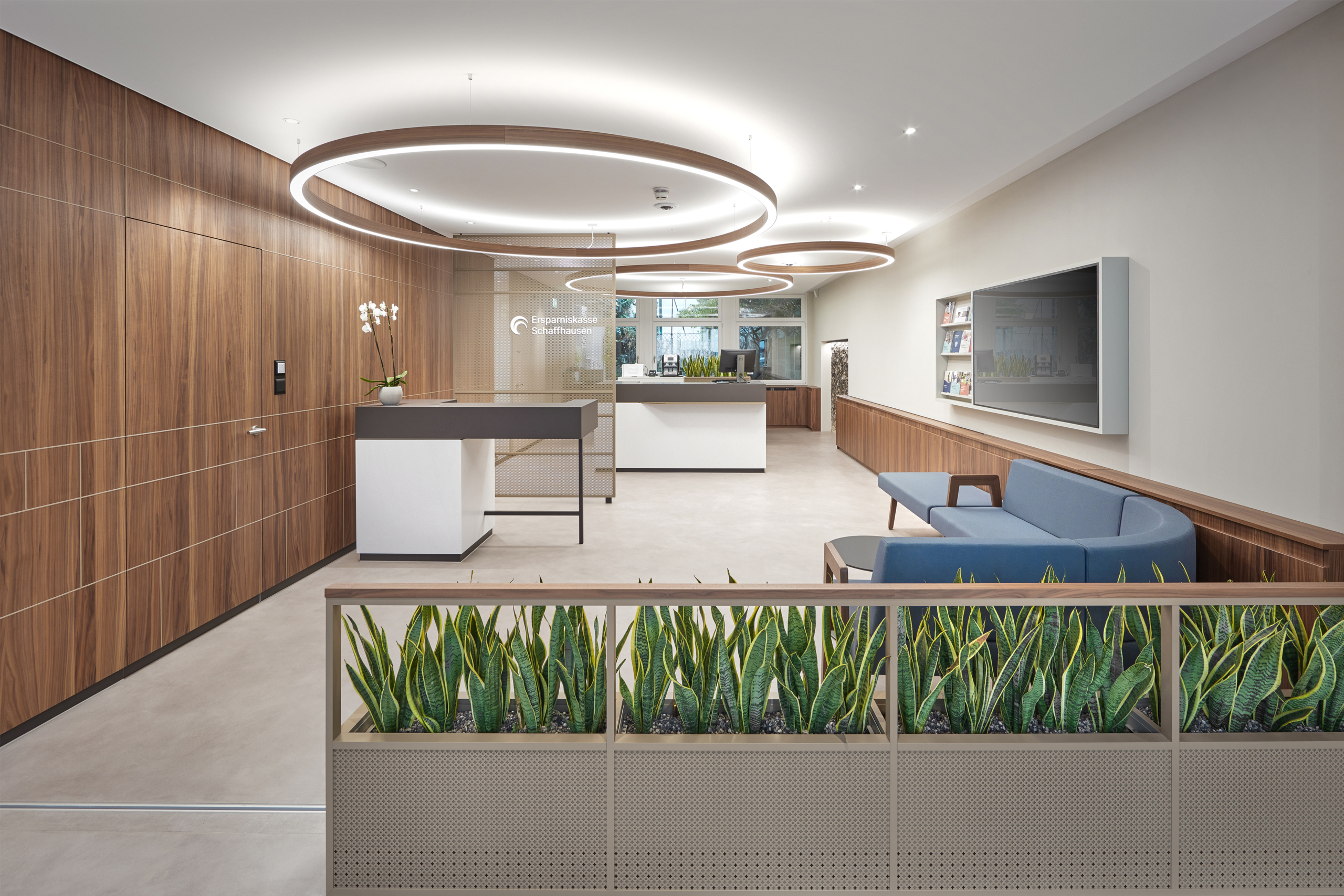 Comme réponse à la question comment les banques accueillent leurs clients, nous avons aménagé les locaux de l’Ersparniskasse Schaffhouse en partant de la philosophie de la «culture de bienvenue». Dans le nouvel espace clientèle, plus rien ne rappelle les locaux autrefois peu accueillants et biscornus avec leurs plafonds déportés et leurs imposants guichets.