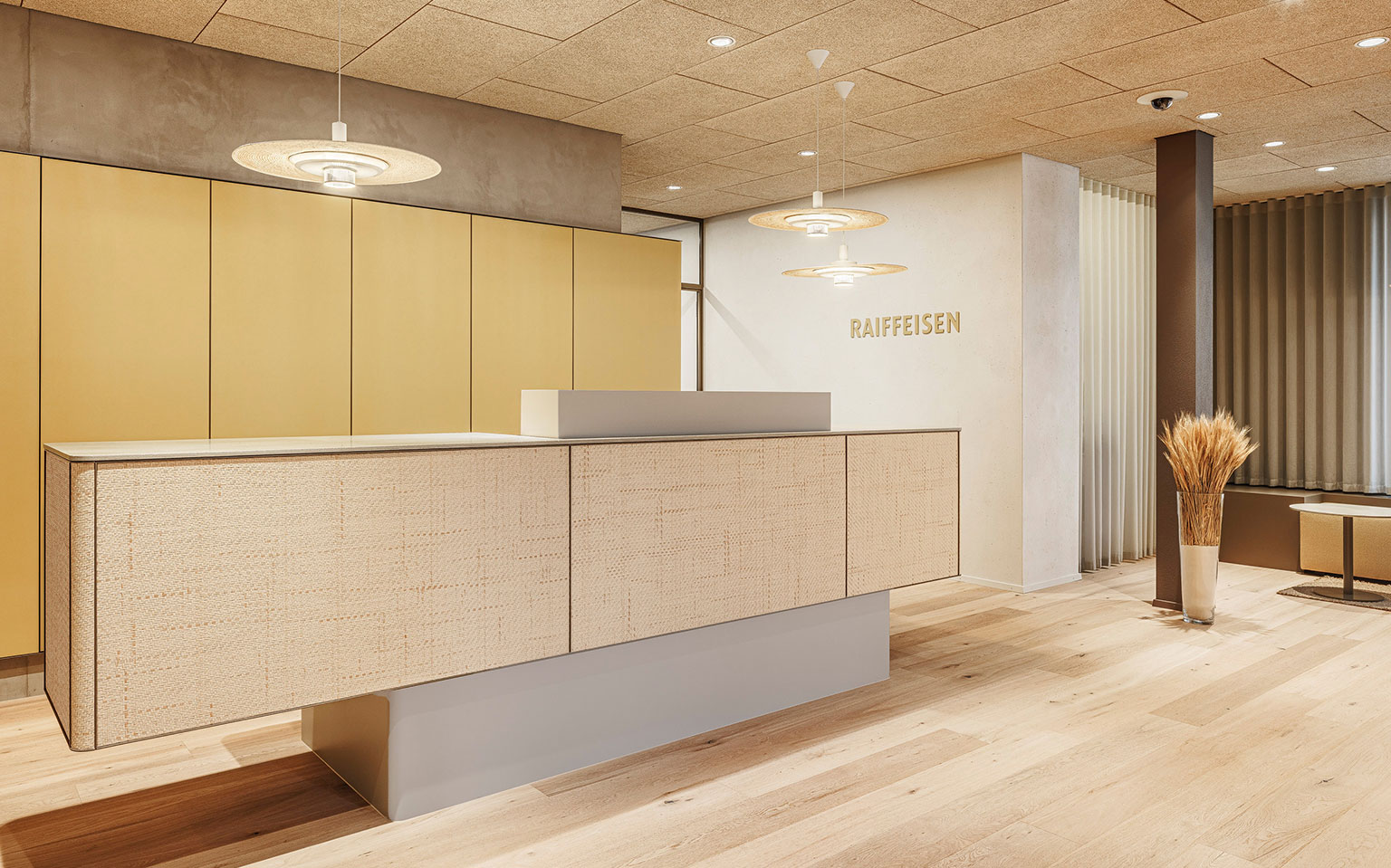 L’architecture intérieure a été fortement influencée par l’identité culturelle de la région de Berikon. Au XIXe siècle, la région était un centre important du tressage de la paille. Cette signification historique a directement nourri le concept de design : des matériaux naturels tels que la paille et le bois ainsi que des tonalités chaudes créent une ambiance authentique et accueillante. La tradition régionale se marie ainsi avec un design bancaire contemporain.