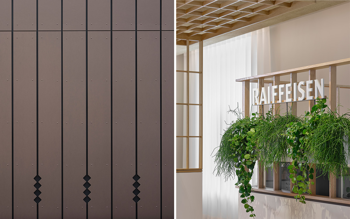 En parcourant la vallée de Worblen et de l’Emmental, nous avons trouvé notre source d’inspiration dans les motifs décoratifs et ornementaux récurrents, en forme de losange, des fermes historiques à l’architecture caractéristique de ce territoire. Ils nous ont servi de base pour une réinterprétation contemporaine dans ce langage architectural endémique. En fonction des alentours des succursales, nous avons utilisé différentes formes et combinaisons de losanges : de la forme originelle géométrique pour la banlieue urbaine d’Ostermundigen à l’ornementation travaillée pour la campagne. Nous créons ainsi une image globale qui reflète les valeurs de la Banque Raiffeisen Worblen-Emmental et qui met en relief et renforce son identité.