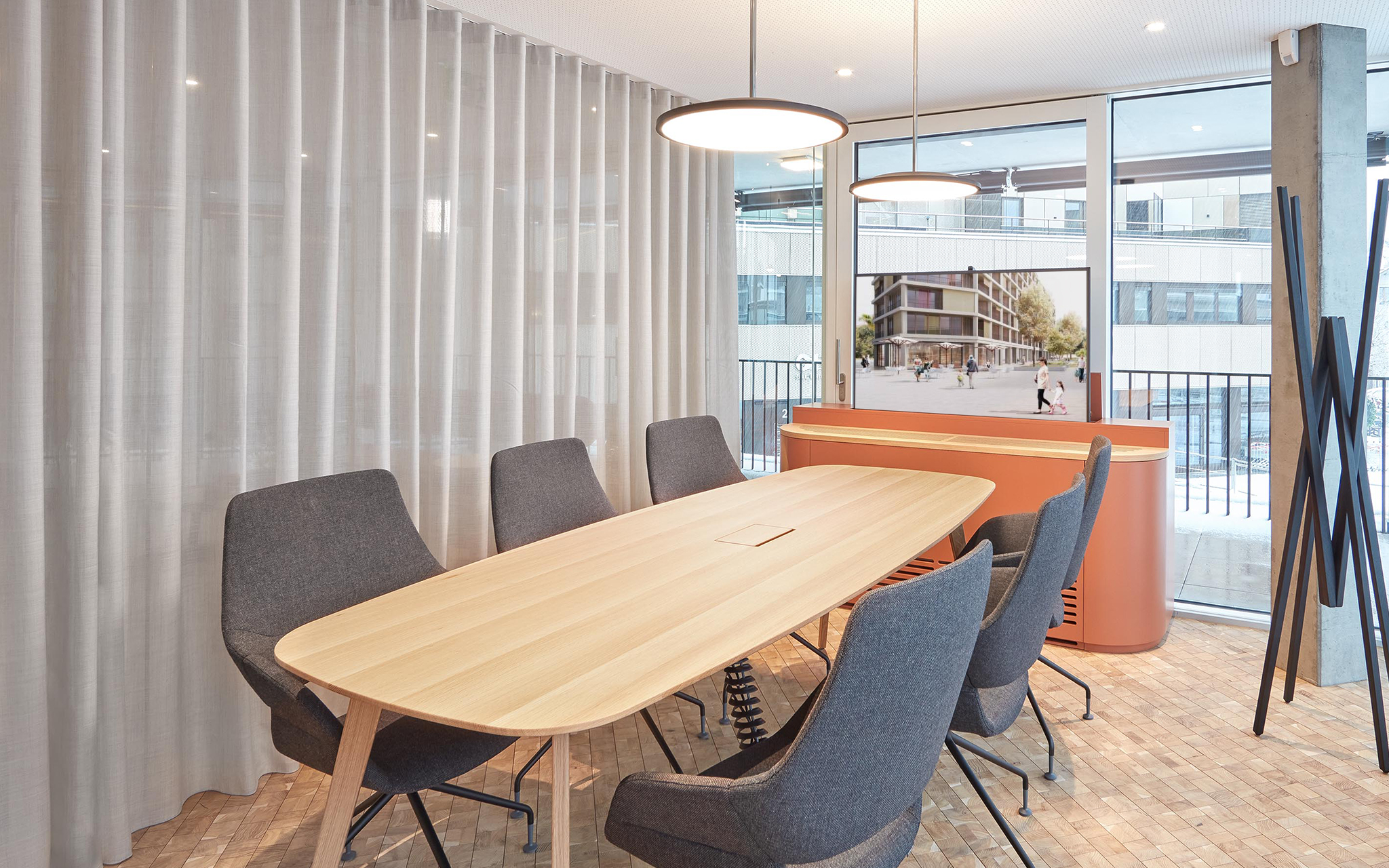 La banque, placée à l’avant du bâtiment, se trouve sur deux étages. La complexité était d’intégrer toutes les exigences sur une surface aussi compacte que possible, sans que l’espace ne perde de son évidence. En plus d’un espace clientèle et d’une zone 24h/24 avec des possibilités de conseils discrets au rez-de-chaussée, le deuxième étage abrite une zone plus discrète avec un team office, un espace café avec balcon ainsi que différents salons de conseil.