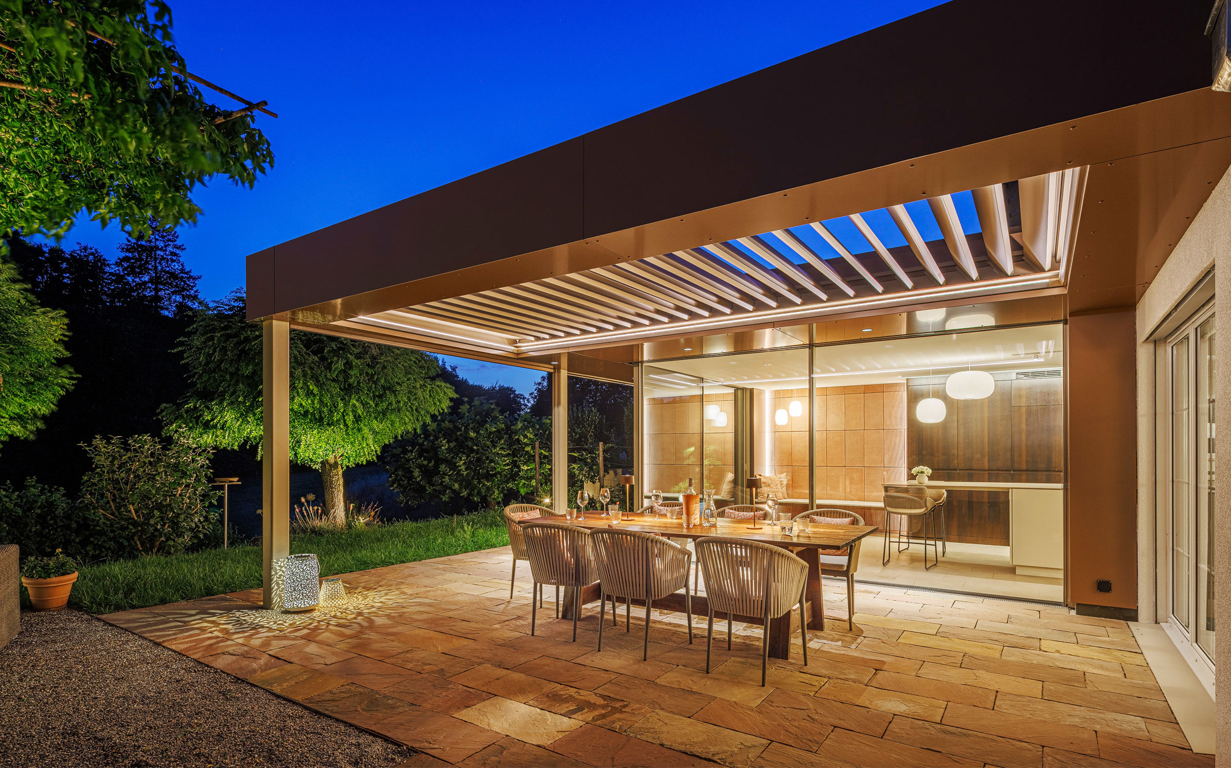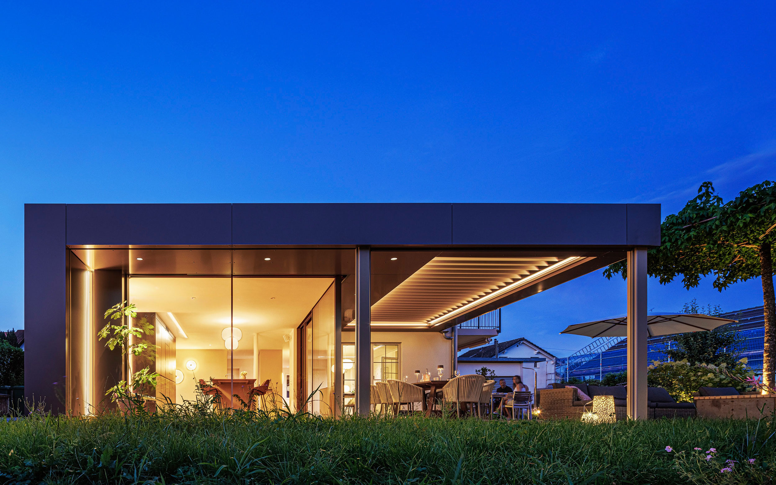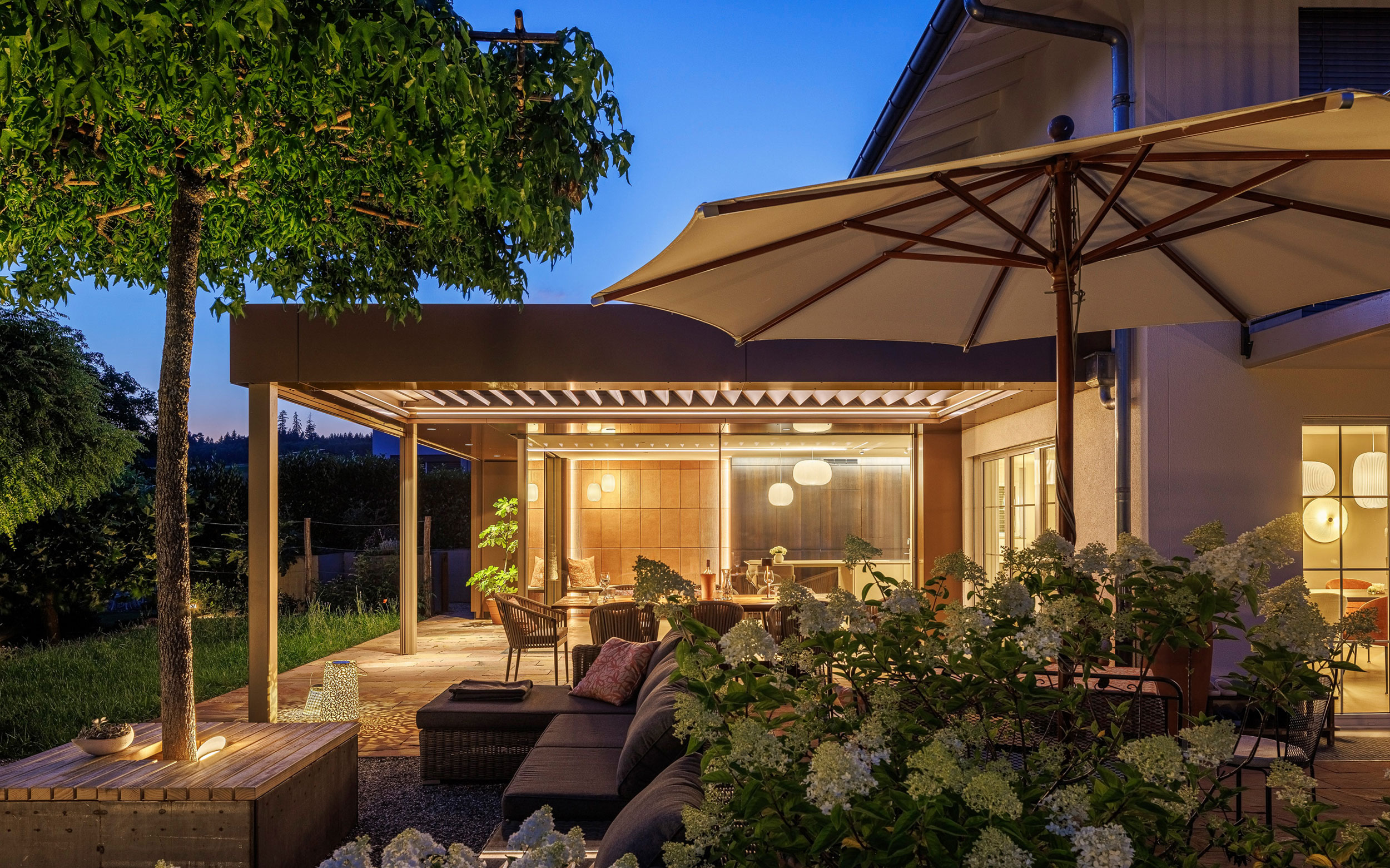 Der teilverglaste, extensiv begrünte Anbau erweitert den Wohnraum und öffnet ihn zur Natur. Neigbare Lamellen sorgen für Schutz vor starker Sonneneinstrahlung oder Regen und verändern je nach Wetter und Tageszeit die Atmosphäre: mal offen und weit, mal geborgen und geschützt. So entsteht ein Ort für stille Momente, gesellige Abende und das einfache Erleben des Gartens — das ganze Jahr über.