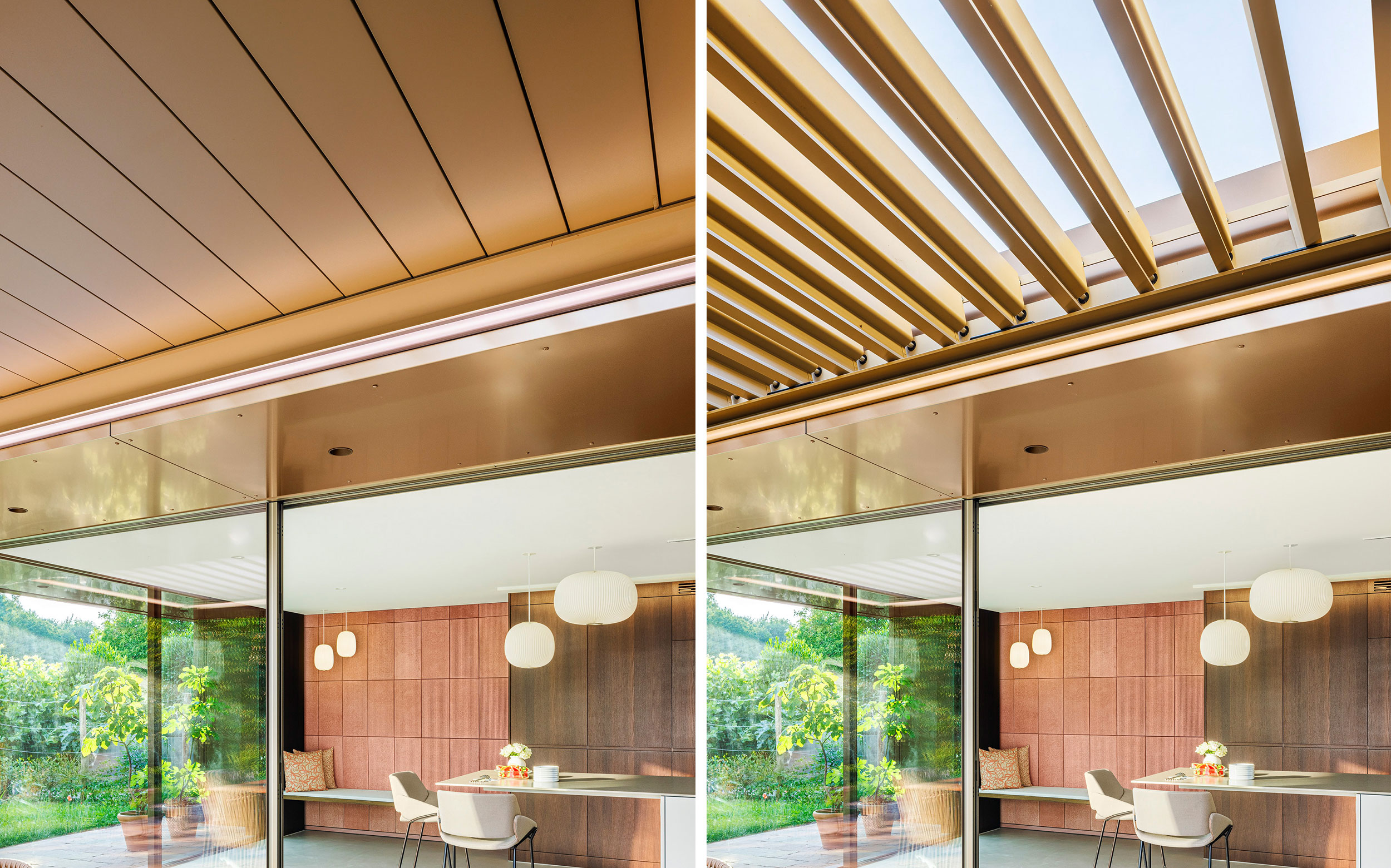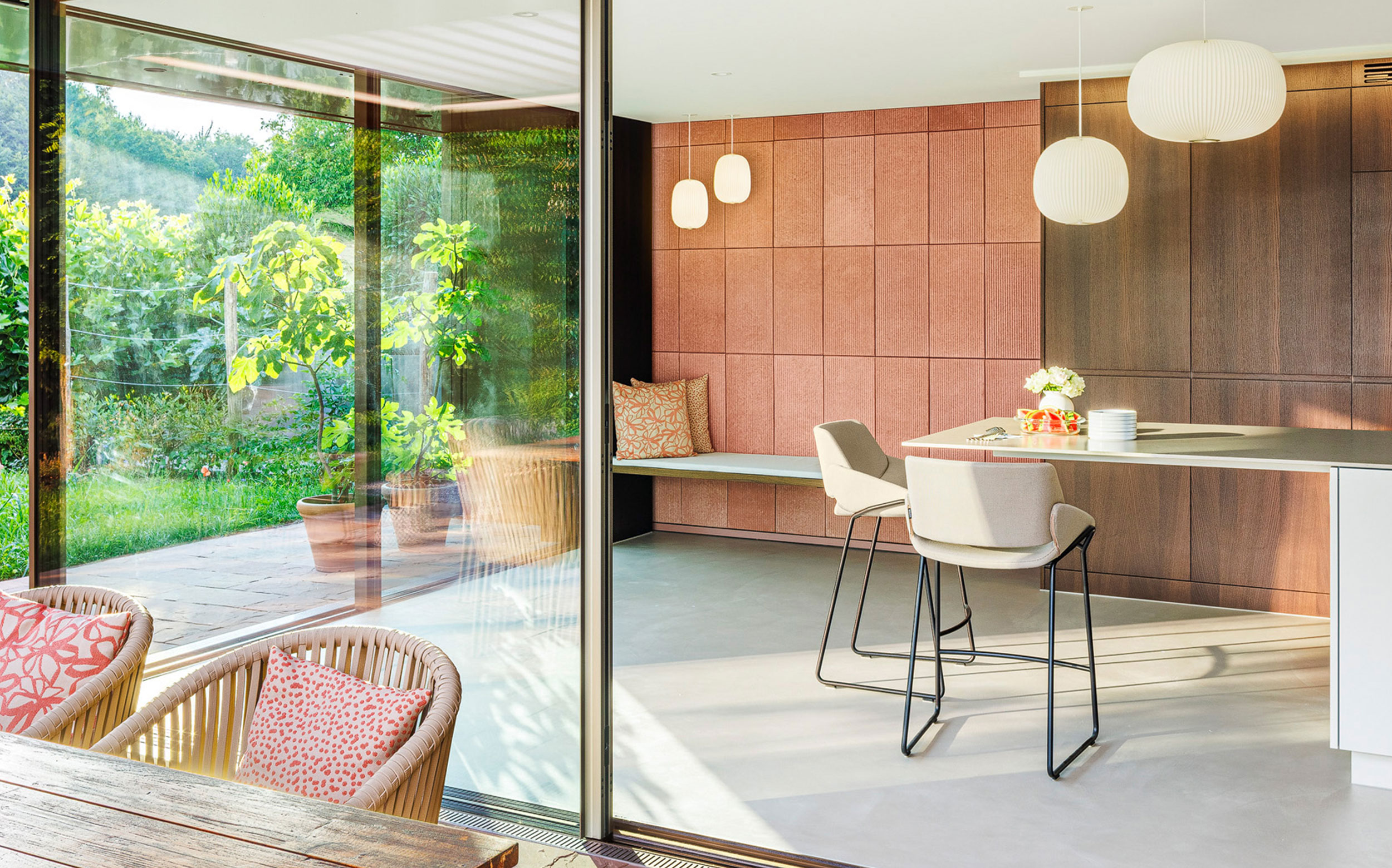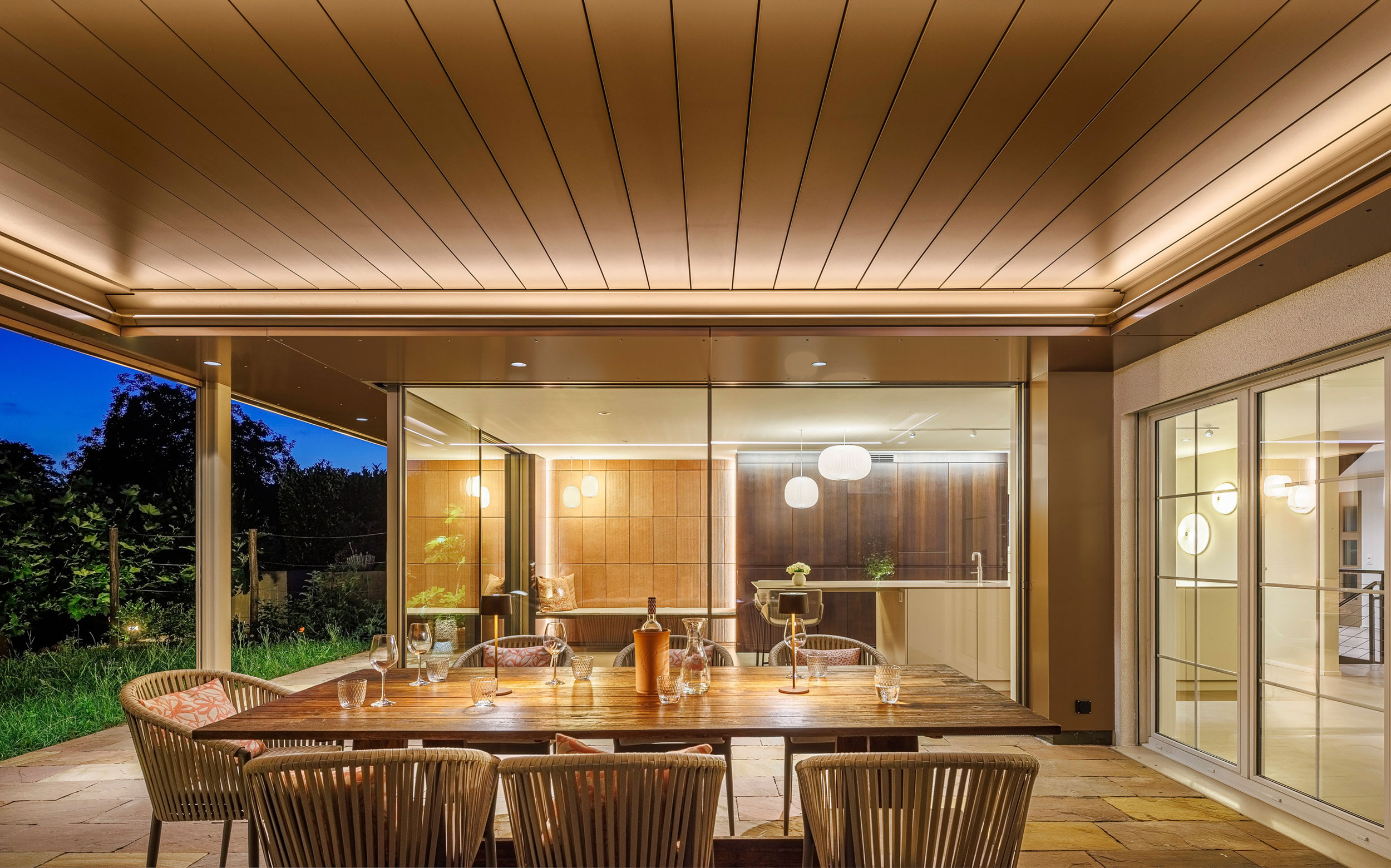 Der teilverglaste, extensiv begrünte Anbau erweitert den Wohnraum und öffnet ihn zur Natur. Neigbare Lamellen sorgen für Schutz vor starker Sonneneinstrahlung oder Regen und verändern je nach Wetter und Tageszeit die Atmosphäre: mal offen und weit, mal geborgen und geschützt. So entsteht ein Ort für stille Momente, gesellige Abende und das einfache Erleben des Gartens — das ganze Jahr über.