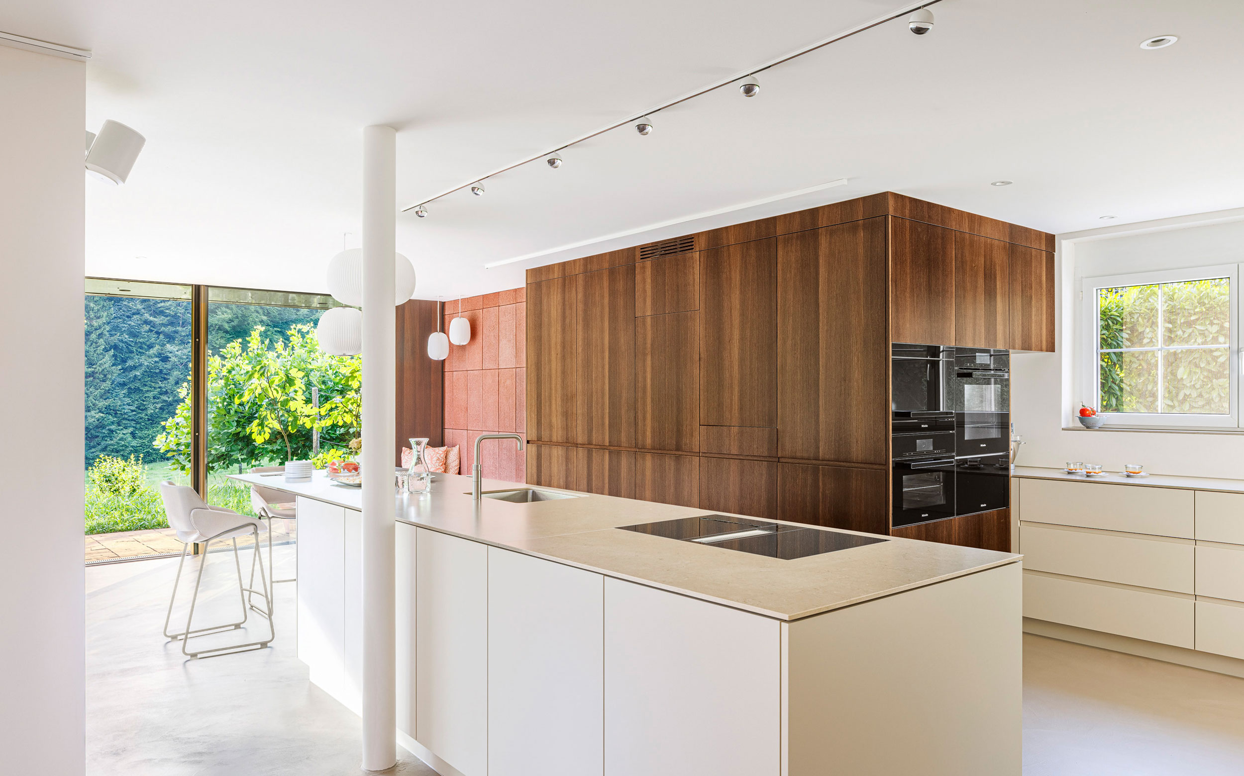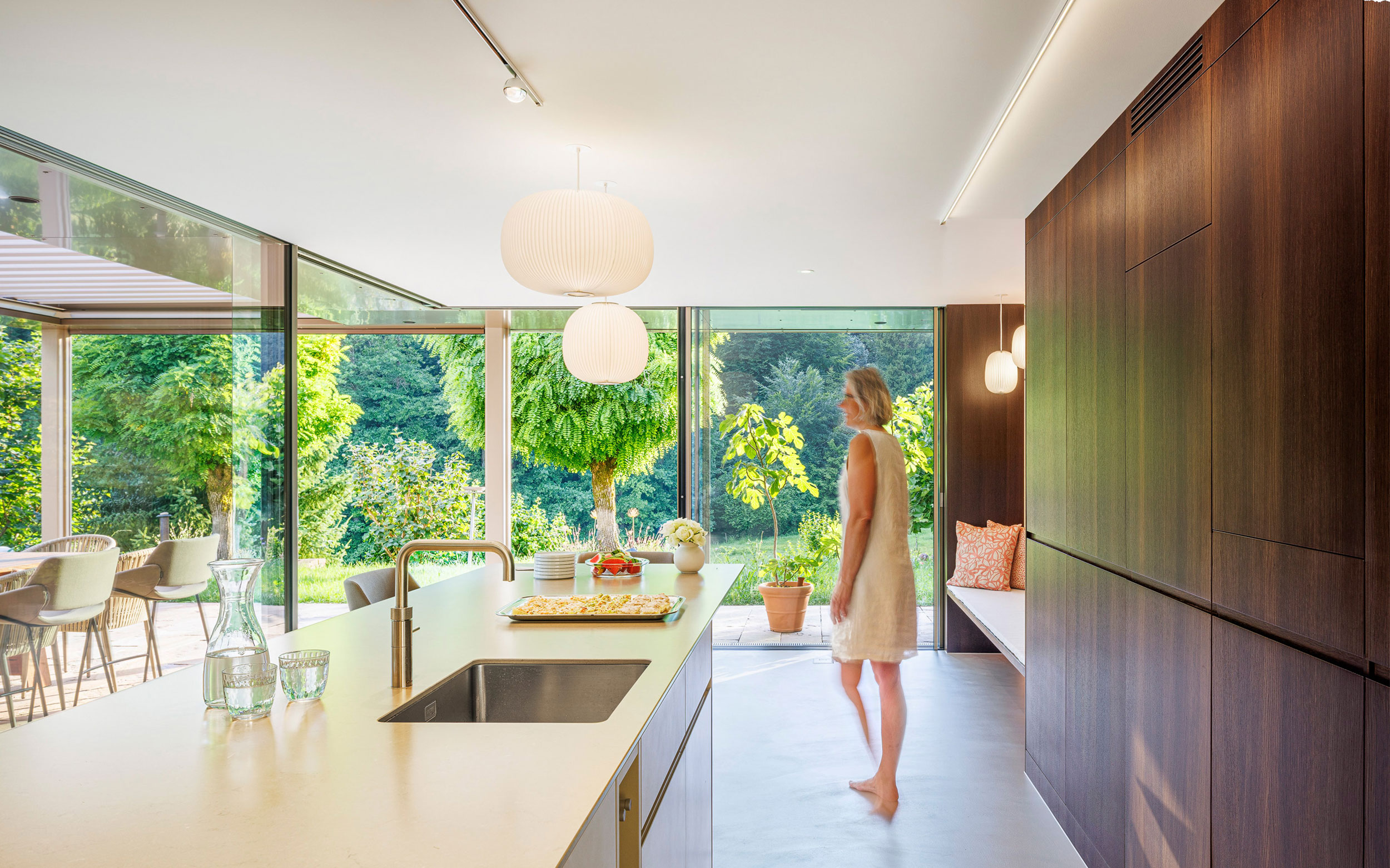 Das Einfamilienhaus verfügte im Erdgeschoss zwar über attraktive Öffnungen, jedoch kaum über einen räumlichen Bezug zum Aussenraum. Die Küche war funktional, aber nicht erlebnisorientiert gestaltet. Der Wunsch nach Veränderung wurde spürbar – es sollte ein Ort entstehen, an dem sich Garten und angrenzender Wald das ganze Jahr über erleben lassen.