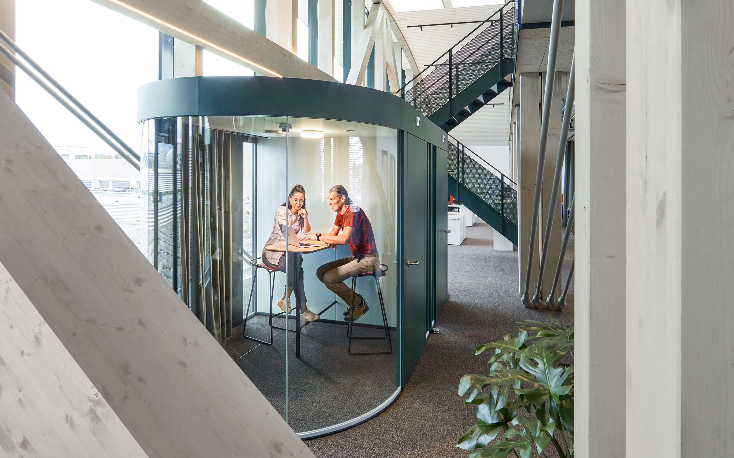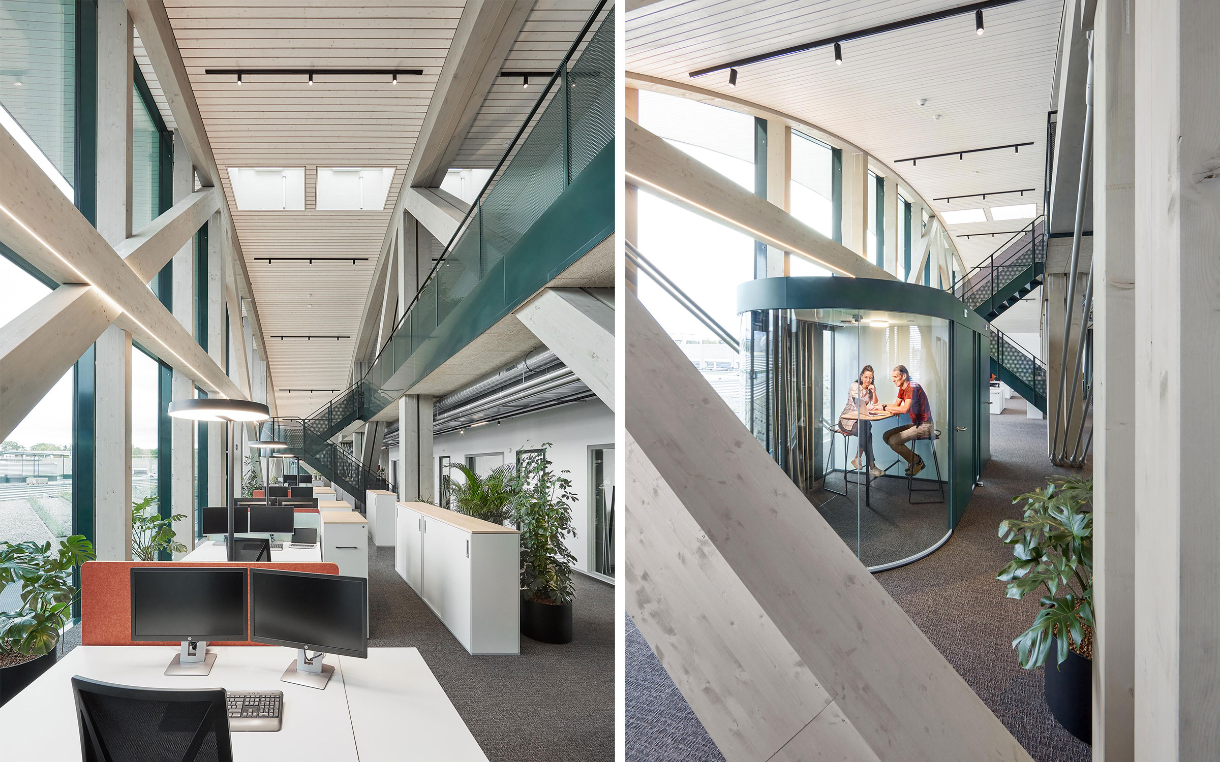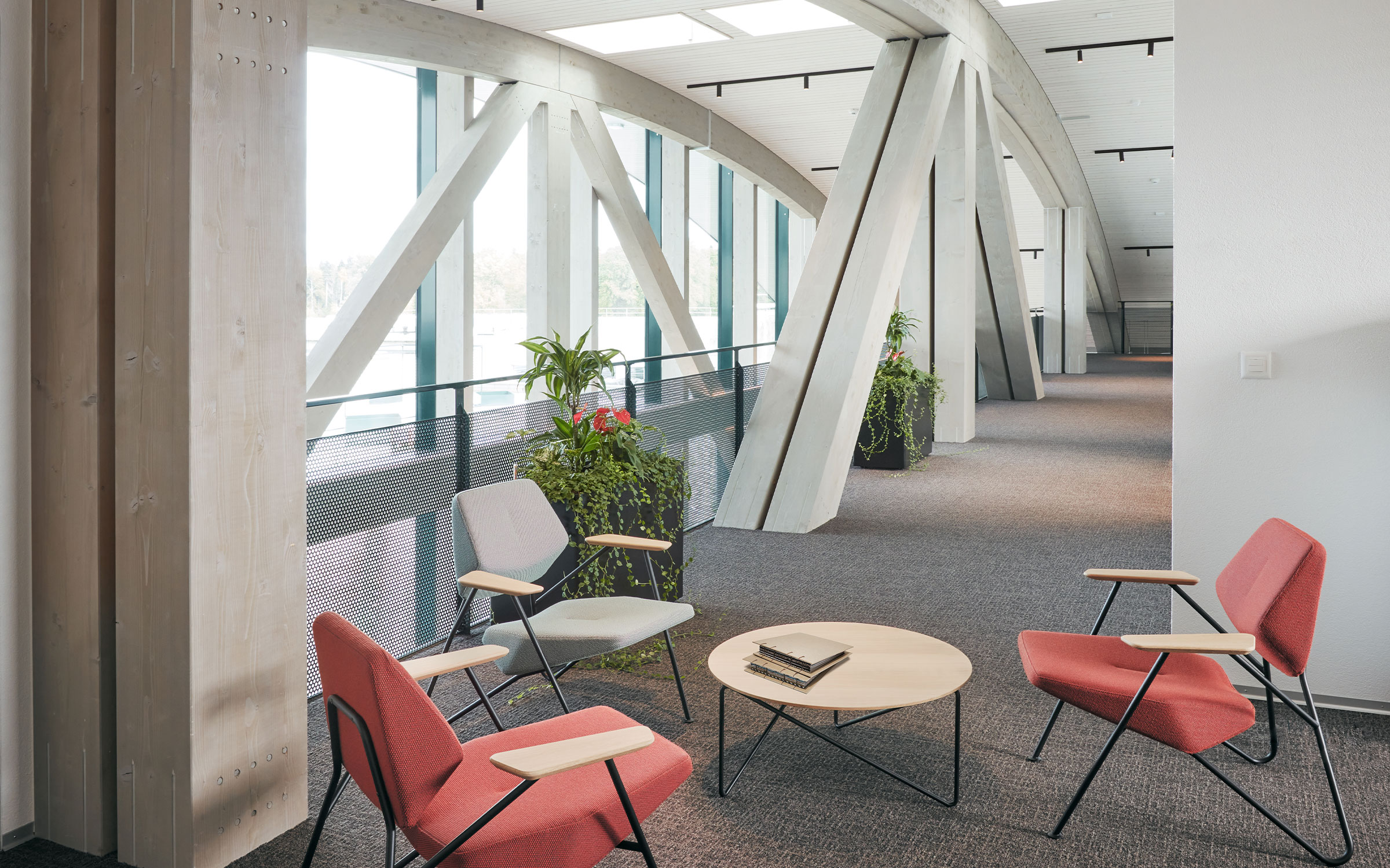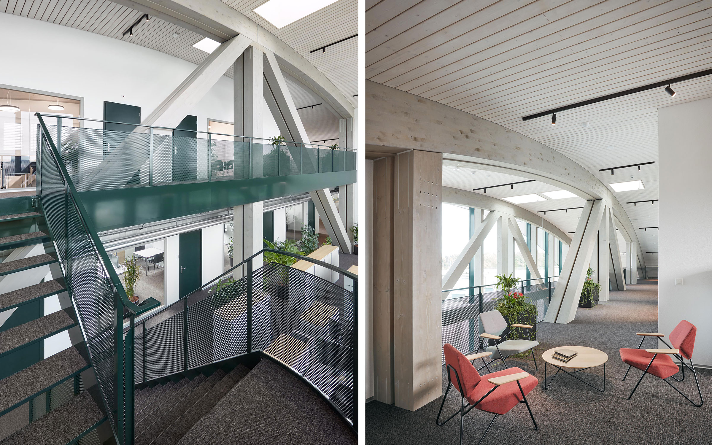 Die zwei Tonnendächer auf tragender Holzstruktur beherbergen mehrere Teams von fenaco Landesprodukte, das am bestehenden Standort die Logistikzentrale für Kartoffeln und Gemüse betreibt. Die einladende Arbeitslandschaft beinhaltet eine Bürofläche sowie ein Galeriegeschoss mit Besprechungsräumen und einem Ruheraum. Entstanden ist ein inspirierendes Umfeld, das die Wertschätzung gegenüber den Mitarbeiter*innen zum Ausdruck bringt.