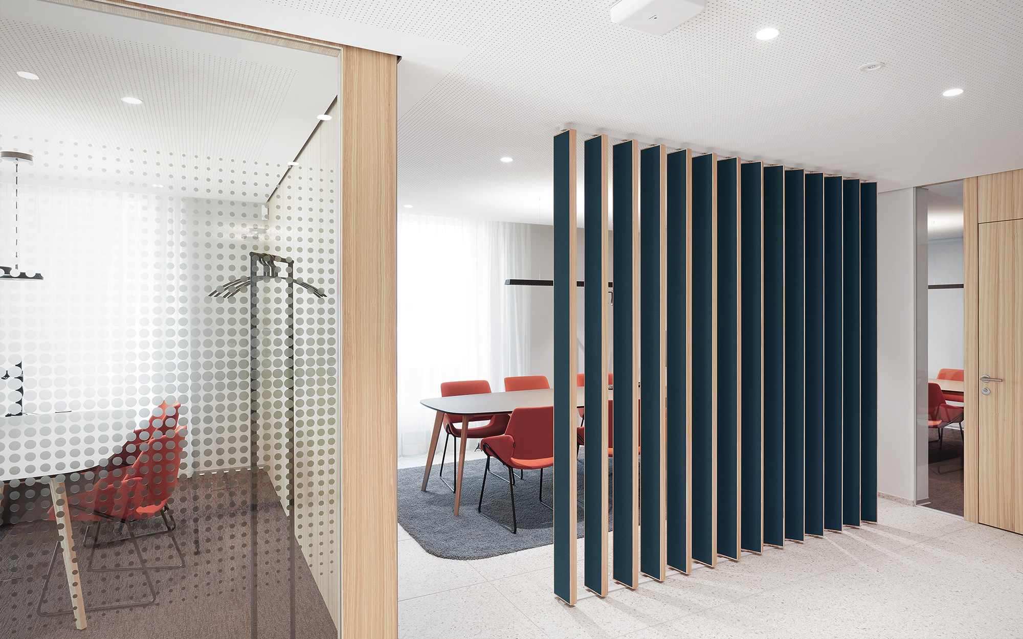 - Flexibel nutzbarer Beratungsraum mit Diskretionselement (360° drehbare Lamellen, in geschlossenem Zustand mit einer überraschend guten akustischen Wirkung)