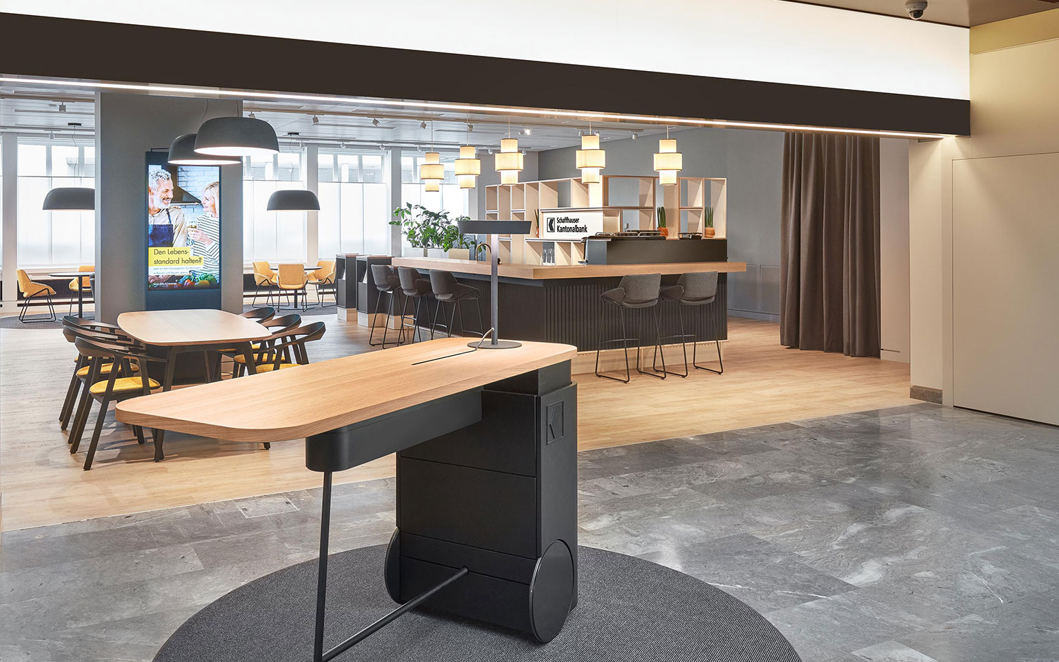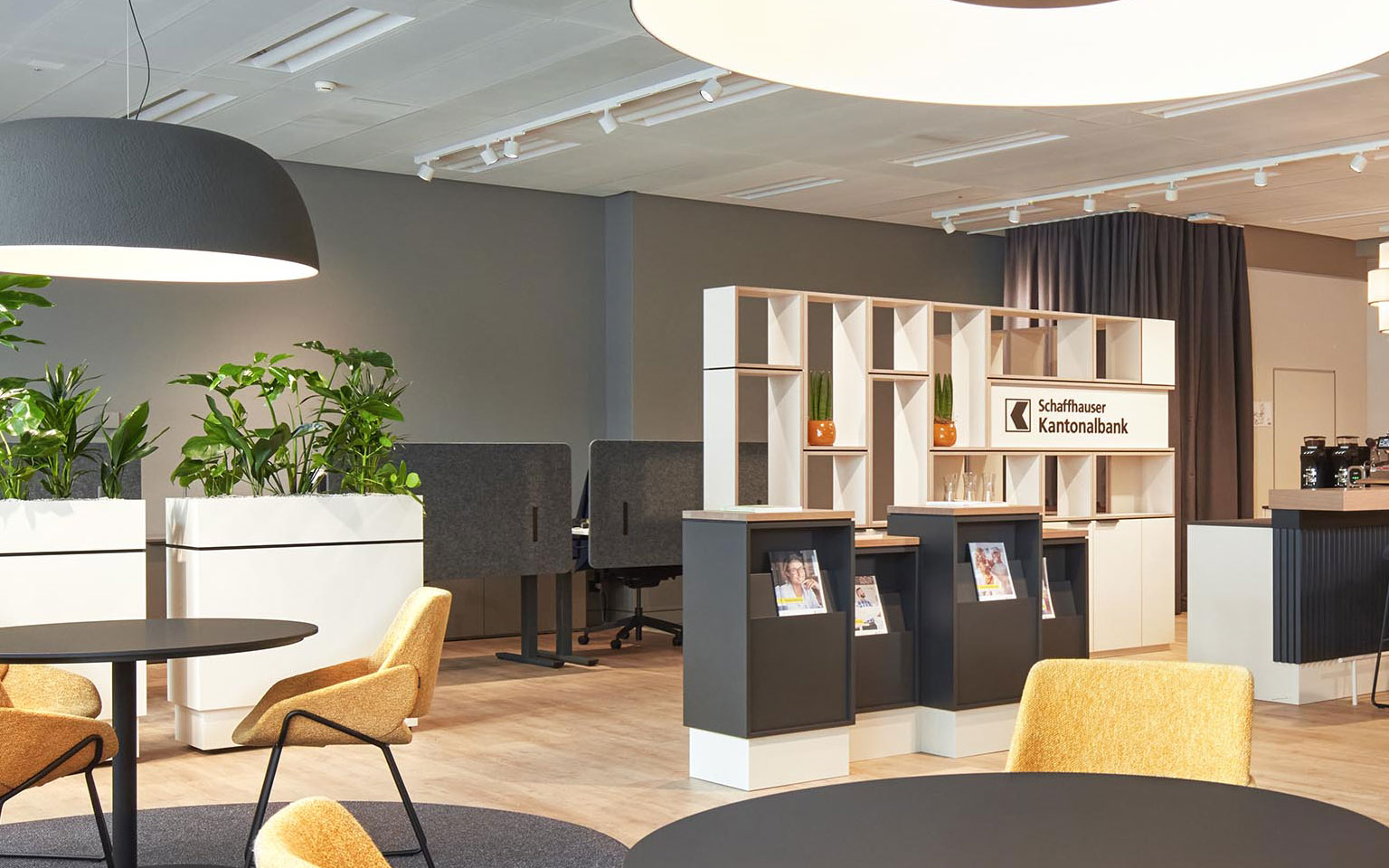 Ein kleiner Eingriff mit grosser Wirkung: mit der «Digitalen Lounge» schafft die Schaffhauser Kantonalbank für ihre Kundschaft stimmungsvolle Räumlichkeiten für die Nutzung innovativer digitaler Bankdienstleistungen.