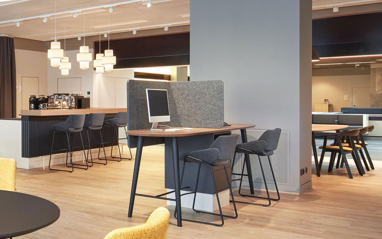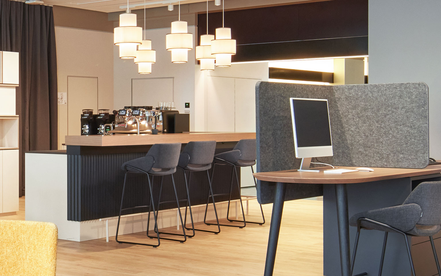 In einem Zeitraum von acht Monaten — vom Planungsstart bis zum Abschluss des Umbaus während des laufenden Bankbetriebs — ist für einen Teilbereich der Kundenzone ein neuer Begegnungsort entworfen und umgesetzt worden: An den E-Stationen und Learning-Desks können sich die Kund*innen mit den Anwendungen im Mobile Banking vertraut machen und erhalten bei Fragen oder Problemen Unterstützung. Darüber hinaus lädt eine gemütliche Kaffeebar zum Verweilen ein und verschiedene Sitzecken bieten Rückzugsorte für Gespräche und Beratungen.