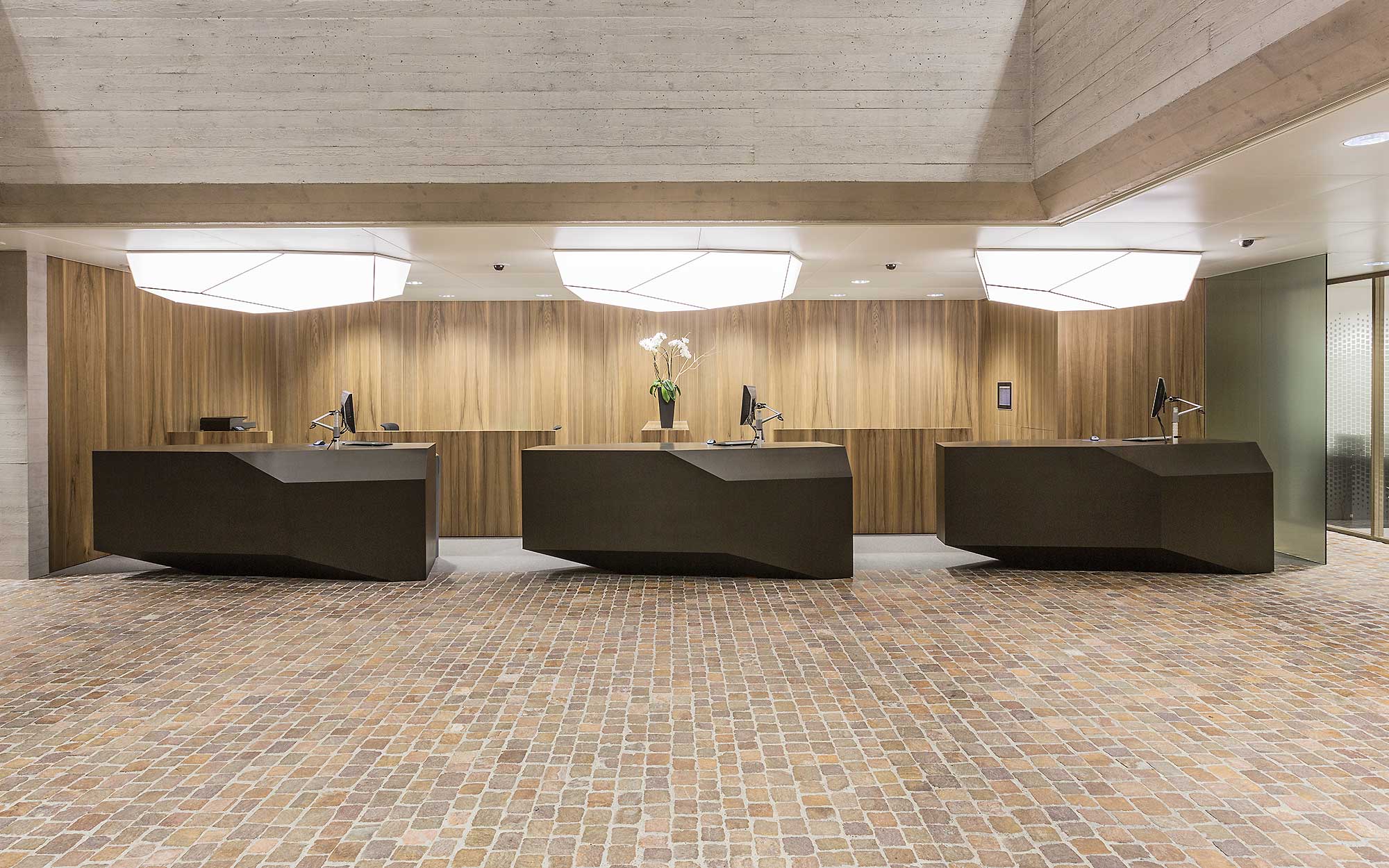 Anlässlich der Renovation des Gebäudes aus den Siebzigerjahren ist ein neues, auf die Bedürfnisse der Kunden ausgerichtetes Konzept umgesetzt worden. Eine attraktive 24-Stunden-Zone, offene Schalter und grosszügige Begegnungs- und Gesprächsbereiche charakterisieren heute die Kundenzone der Hypothekarbank Lenzburg an ihrem Hauptsitz. Der Aussenbereich setzt sich im Innern des Gebäudes fort — an dieser Idee wurde festgehalten. Die grosszügige Kundenhalle bietet zudem Platz für beliebte Events wie „Jazz in der Hypi“.