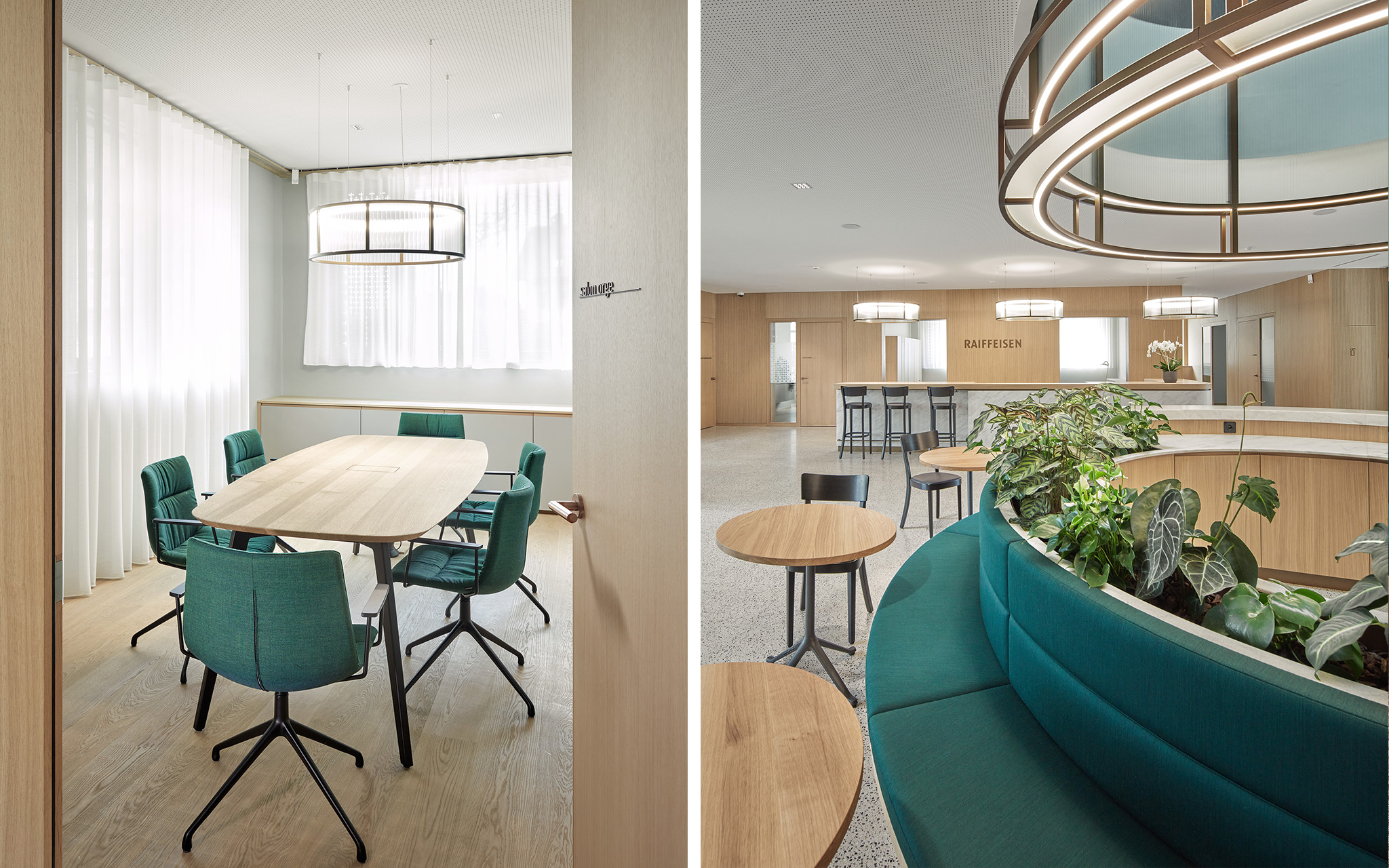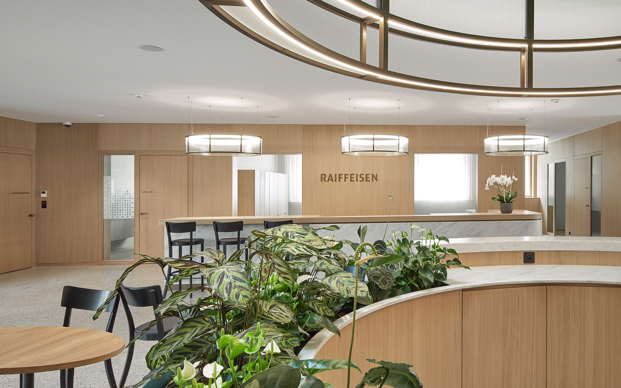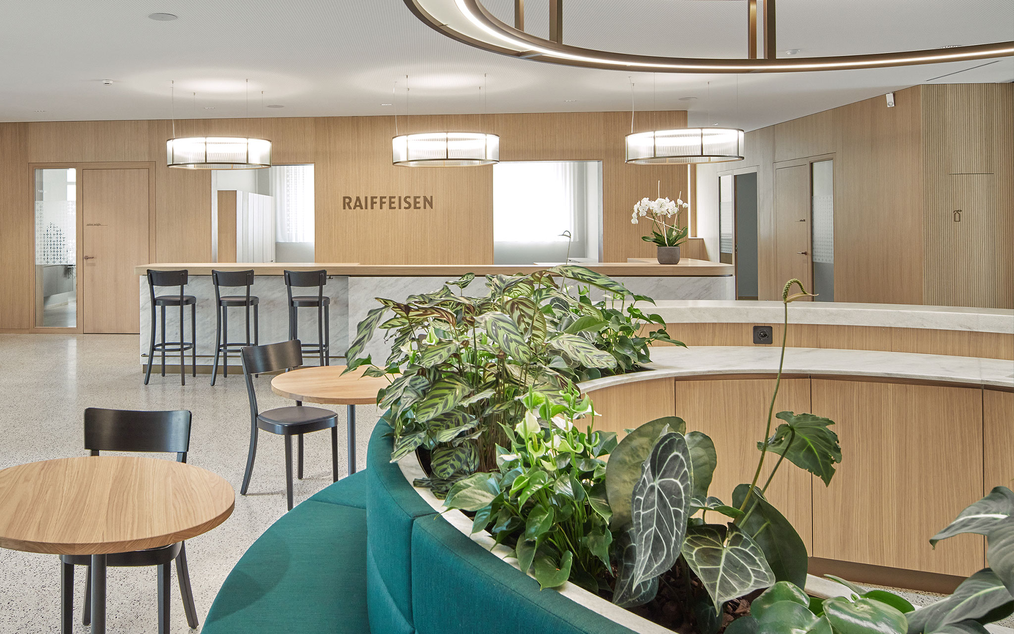 Nachdem RBCH Architekten von Bulle den Wettbewerb für den Bau des neuen Hauptsitzes in Assens gewonnen hatten, waren sie an einer Zusammenarbeit mit einem Innenarchitektur- und Designbüro interessiert, das sie bei der Planung und Gestaltung der Kunden- und Arbeitsräume unterstützt. Wir freuen uns sehr, dass die Wahl auf uns gefallen ist, und danken Raiffeisen Schweiz für die Empfehlung.