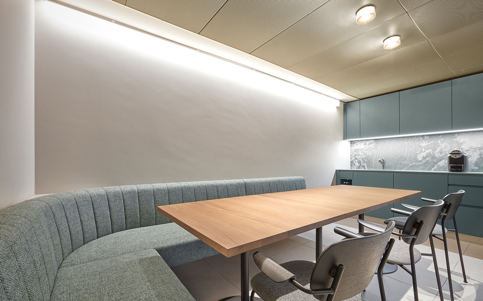 Ein prägendes Element ist der raumverbindende Kaffeebereich, der kurze Beratungsgespräche bei einer Tasse Kaffee ermöglicht. Der anschliessende Raum wird für informelle Beratungen genutzt und bietet gleichzeitig die Möglichkeit für Kundenveranstaltungen.