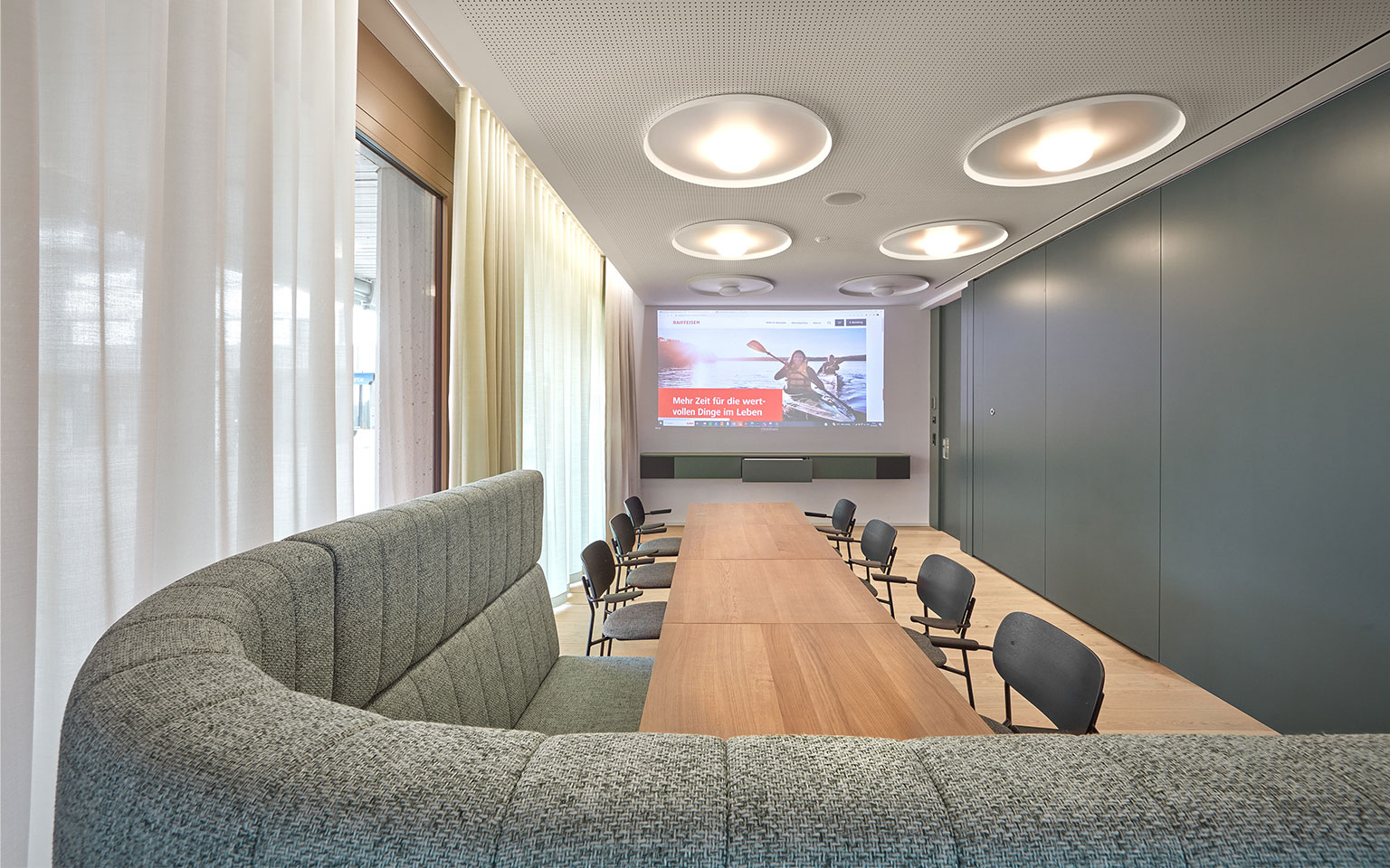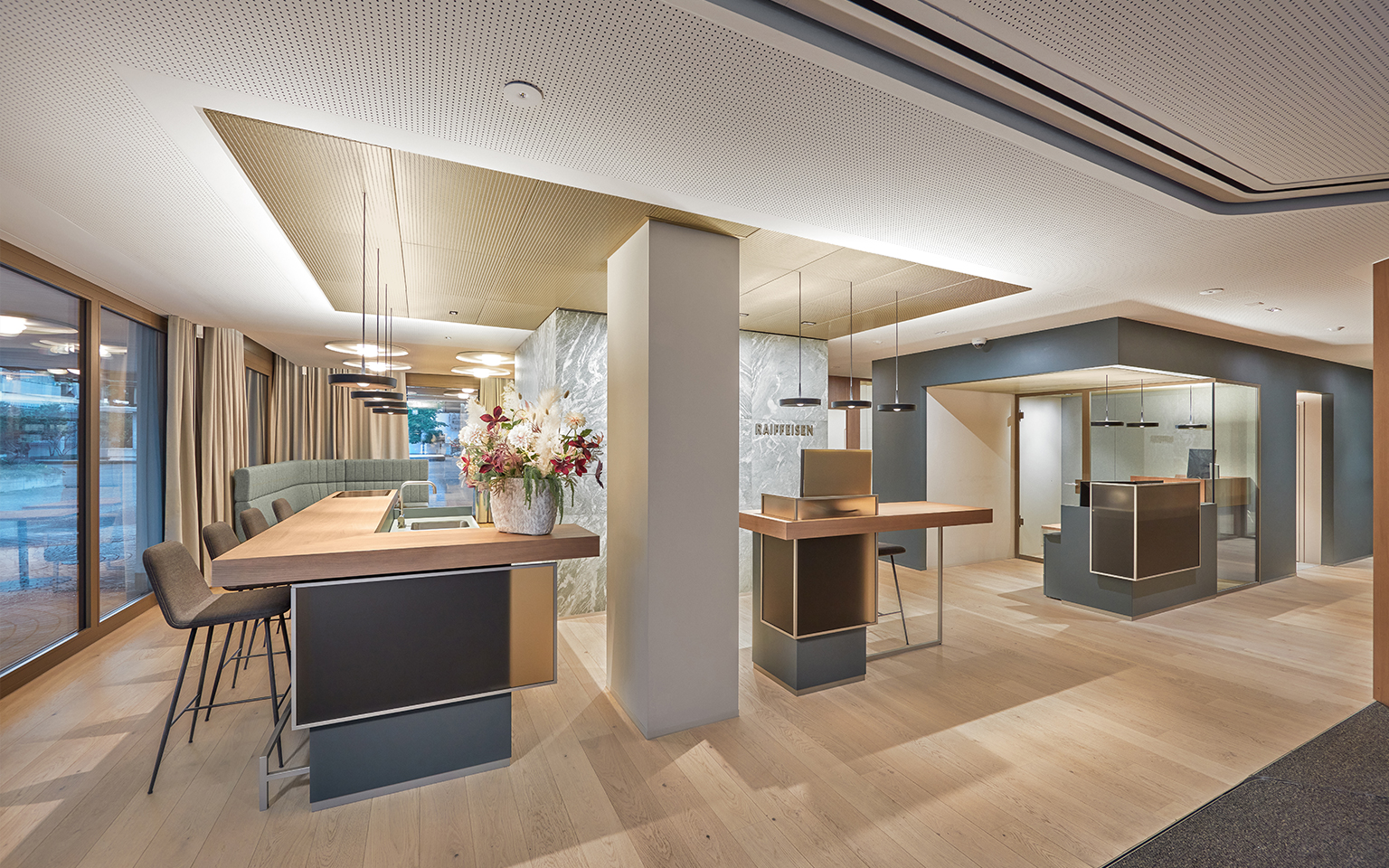 Bei der Totalsanierung und Erweiterung der Raiffeisenbank in Steinhausen hatte die Bank die Gelegenheit, die Fläche im Erdgeschoss zu erweitern und die Büro- und Beratungsräume im ersten Obergeschoss in Wohnungen umzubauen. Die Neugestaltung des Erdgeschosses in drei verschiedene Bereiche schafft ein völlig neues Gemeinschaftsgefühl, das den Kundinnen und Kunden ein herzliches Willkommenserlebnis bietet. Die kompakte Organisation erfüllt alle Anforderungen, ohne dass es räumlich beengt wirkt.
