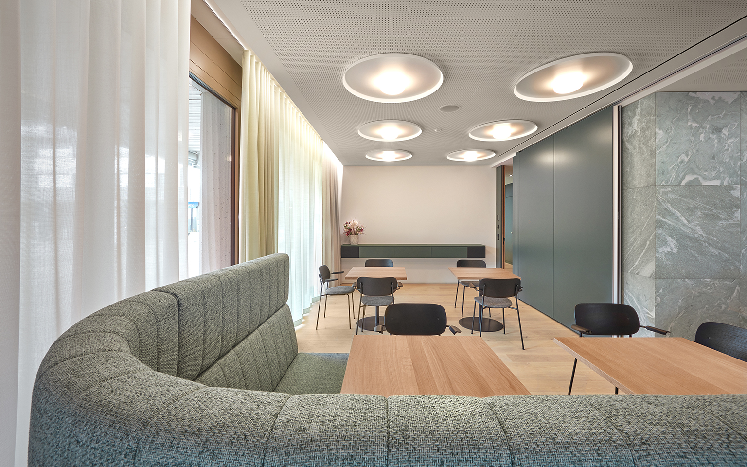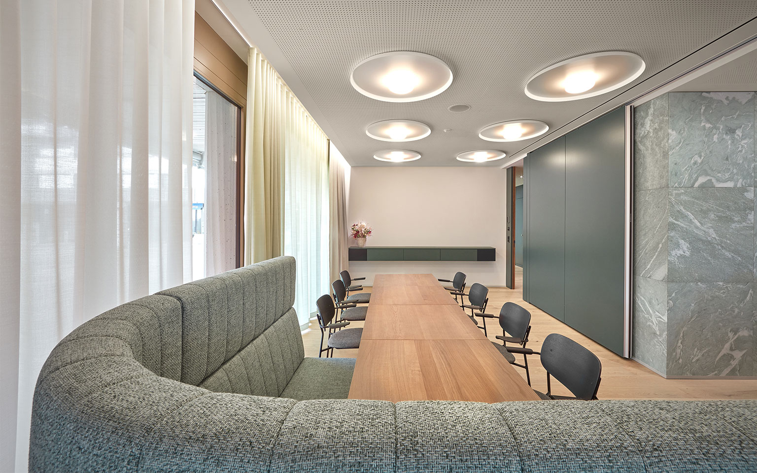 Das Teamoffice haben wir visuell und dennoch diskret mit der Kundenzone verbunden und bei der Materialauswahl auf Qualität und Ästhetik geachtet.