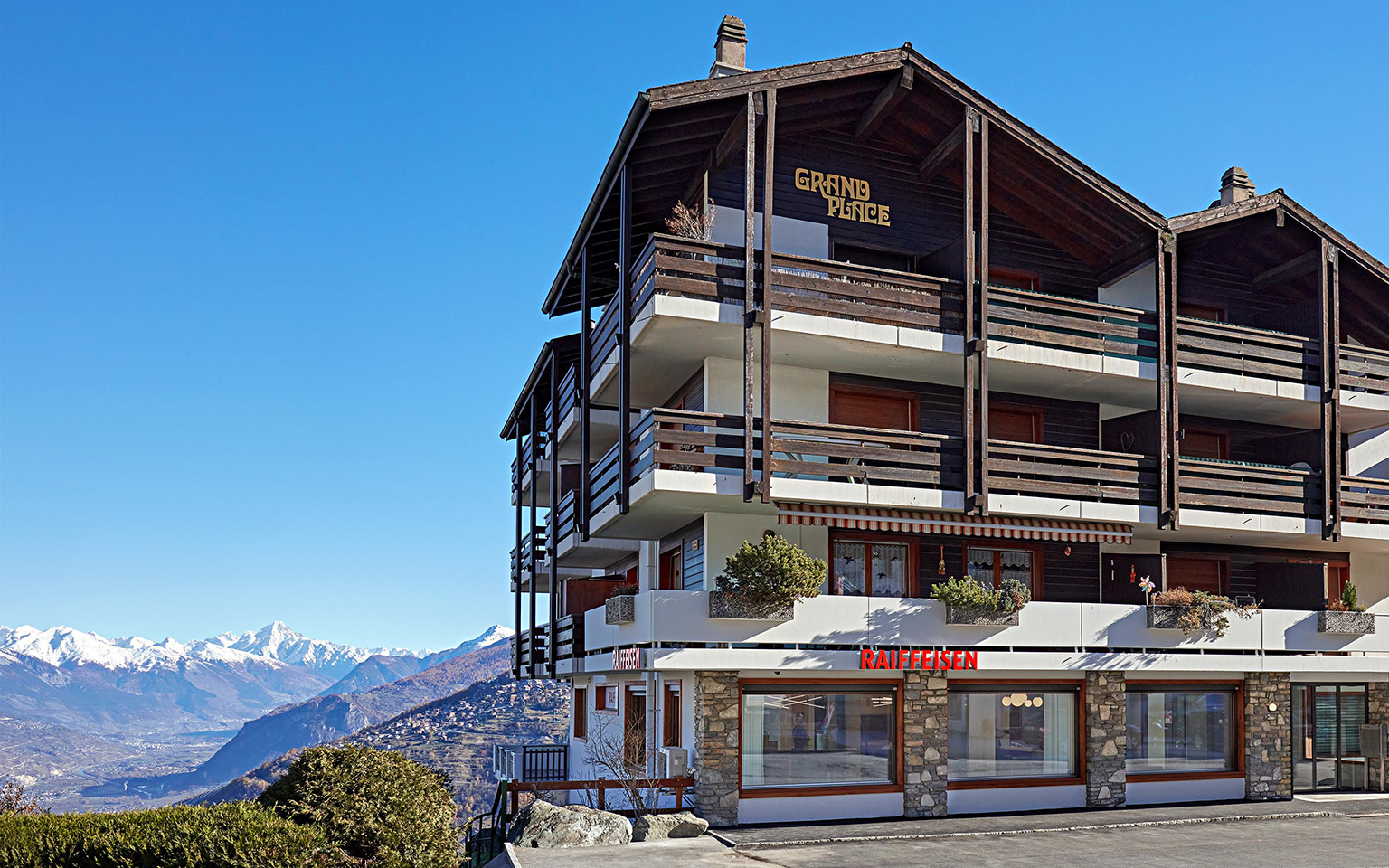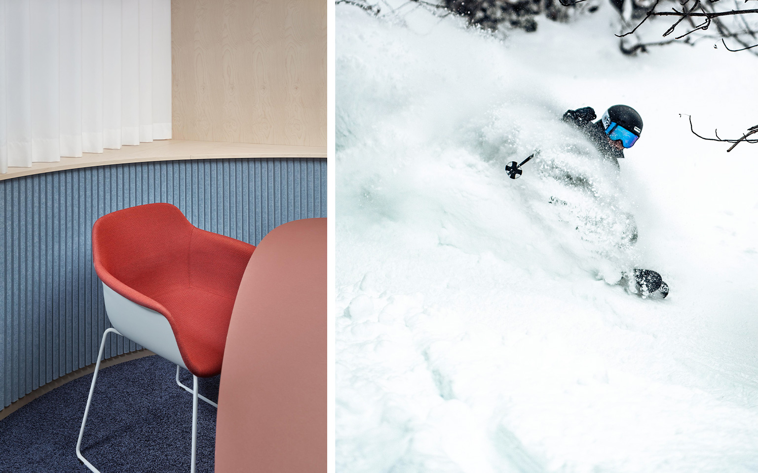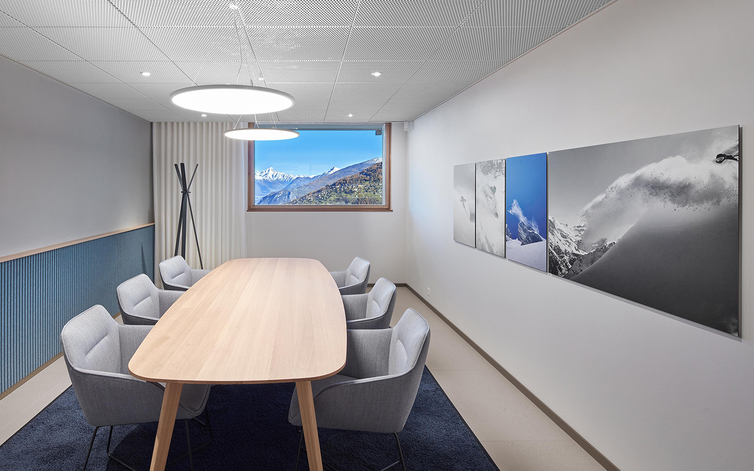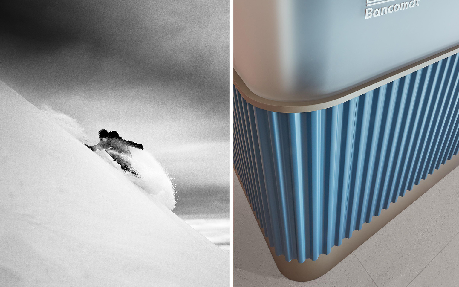 Bei der Teilsanierung der Raiffeisenbank in Nendaz hatte die Bank die Gelegenheit, die Fläche im Erdgeschoss neu zu organisieren und die Beratungszone mit der Themenwelt des Freeride-Schneevergnügens zu verbinden. Der Sicherheitsschalter wich einer offenen Zone, in der verschiedene Arbeits- und Beratungsmöglichkeiten erlebbar sind.