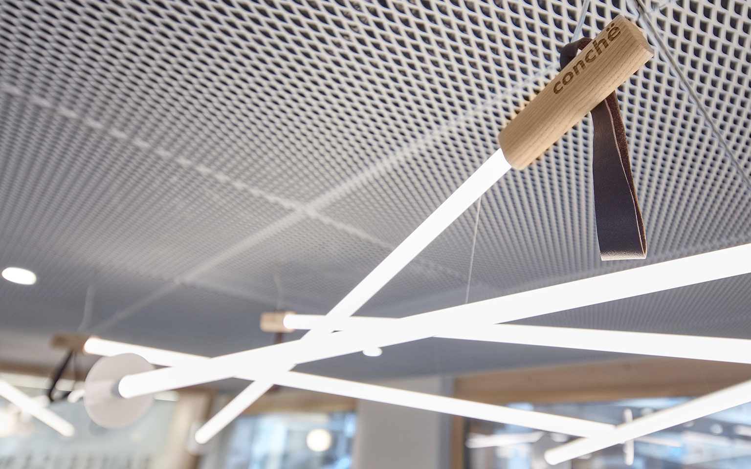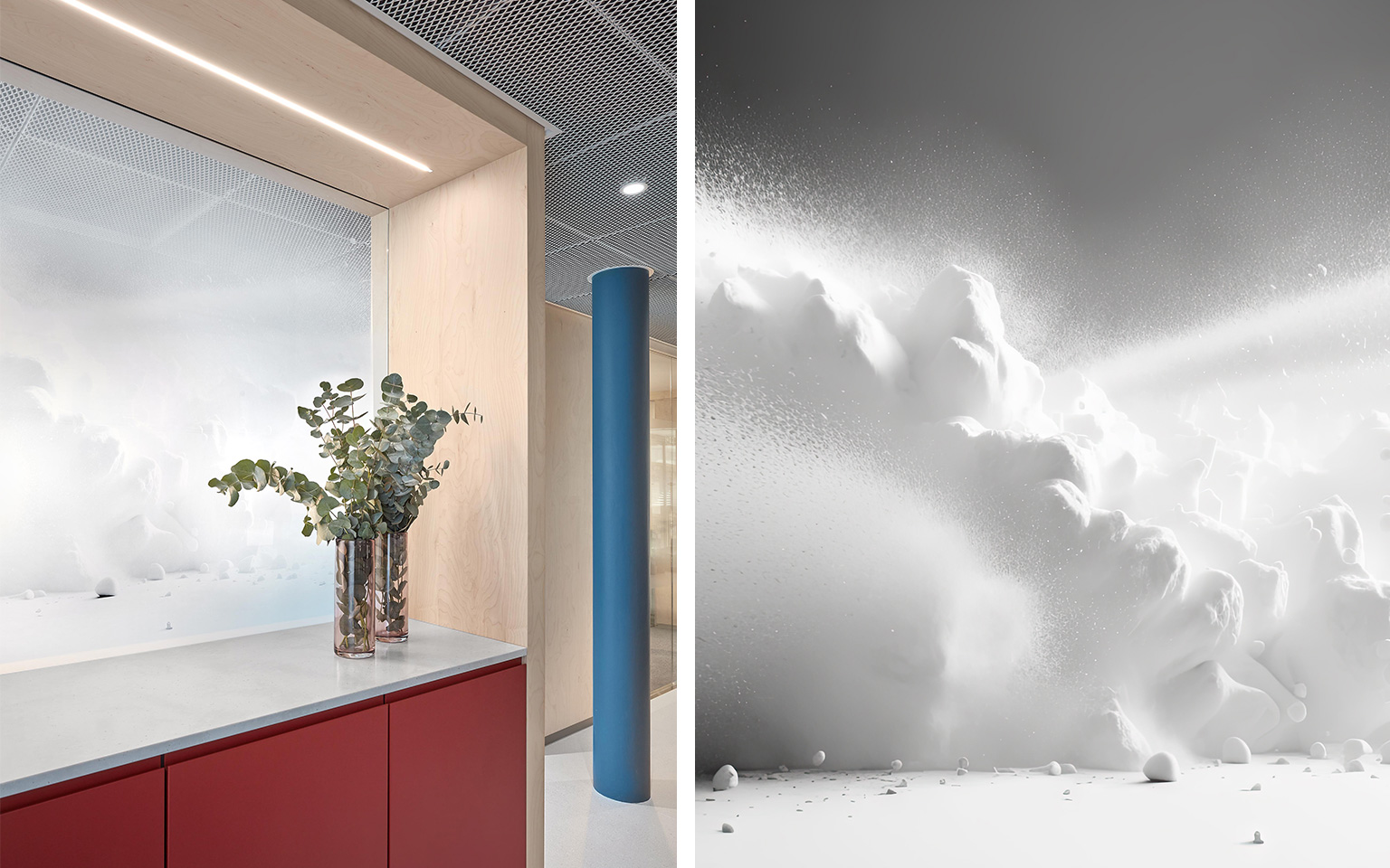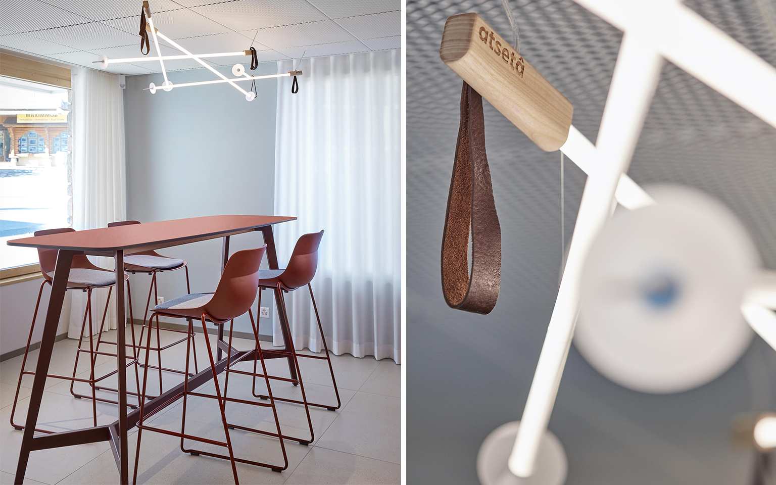 Weitere prägende Elemente sind die Raumtrenner mit AI-generierten Schneestaubwolken und die Skistock-Leuchten mit identitätsstiftenden Patoisbegriffen aus Nendaz, die auch ältere einheimische Kunden ansprechen. Geschätzt wird auch der Komfort, den der ergonomisch höhenverstellbare Desk, die Akustik und die neue Haustechnik bieten.