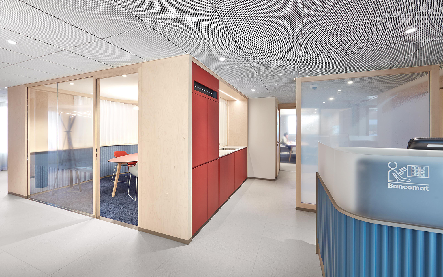 Die Gestaltungstypologie bildet die Basis für weitere Geschäftsstellen, jeweils mit ihren regionalen Merkmalen. Das Birkenholz schafft einen Bezug zum Ort, während die kontrastreichen Farben die Sportwelt integrieren