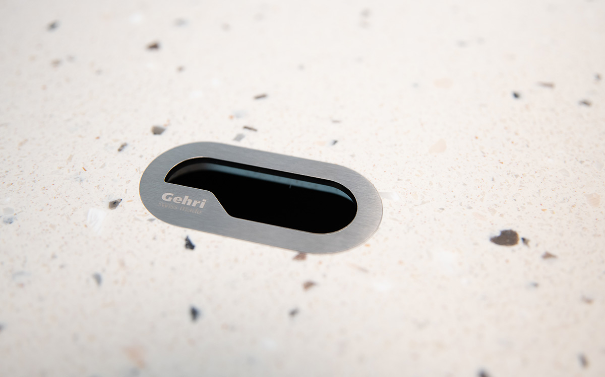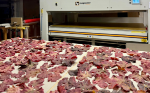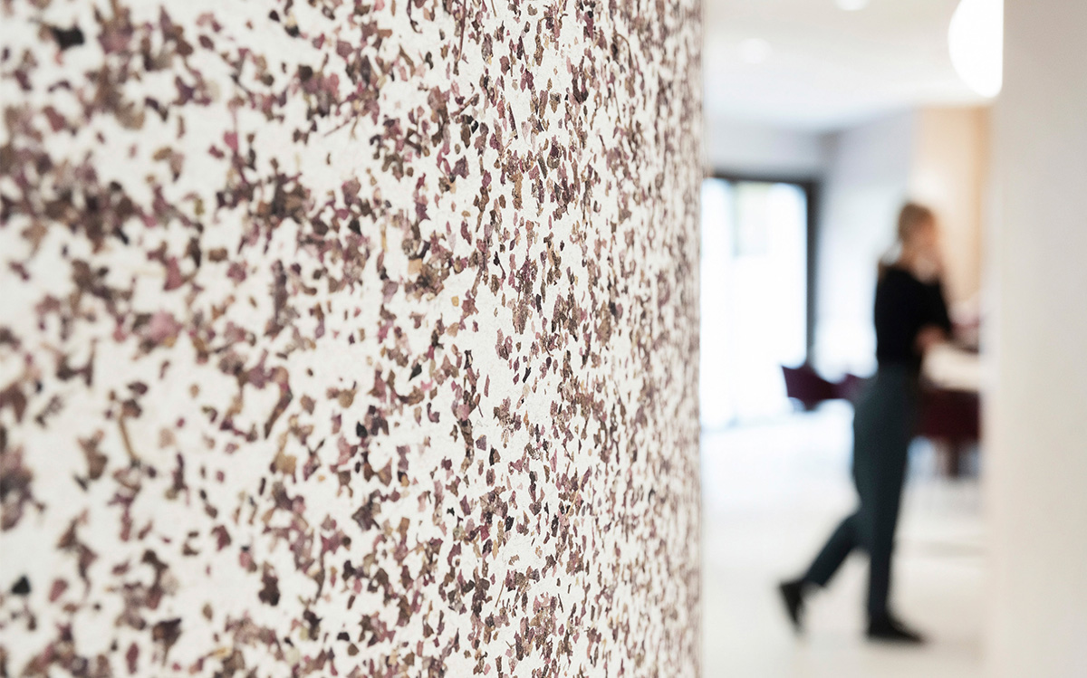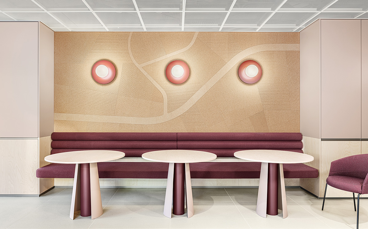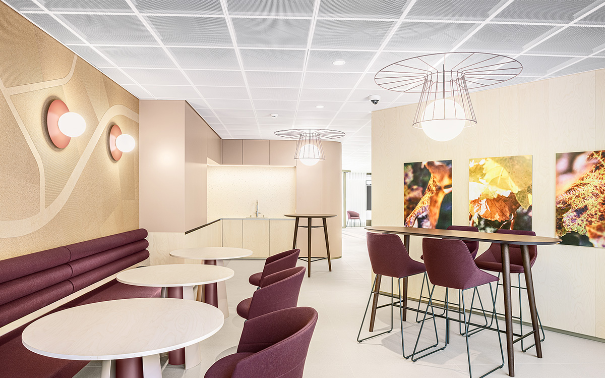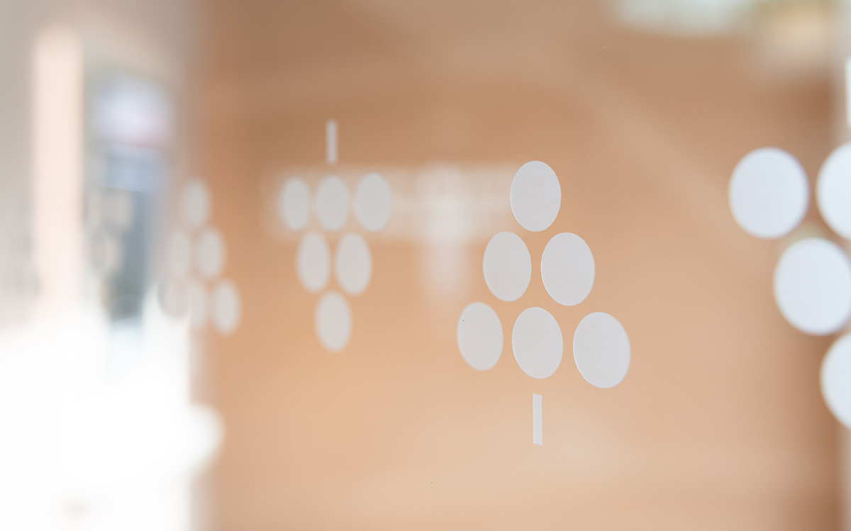 Die Markenwand, belegt mit Weinblättern, die gemeinsam von der Bank und unserem Team in den umliegenden Rebbergen gesammelt wurden, umschliesst den rückwärtigen Warte- und Besprechungsbereich. Zenitales Licht und Leuchten inszenieren Reben und Spaliere, während das raumhohe gebogene Glas die Form der Weinflasche aufnimmt.