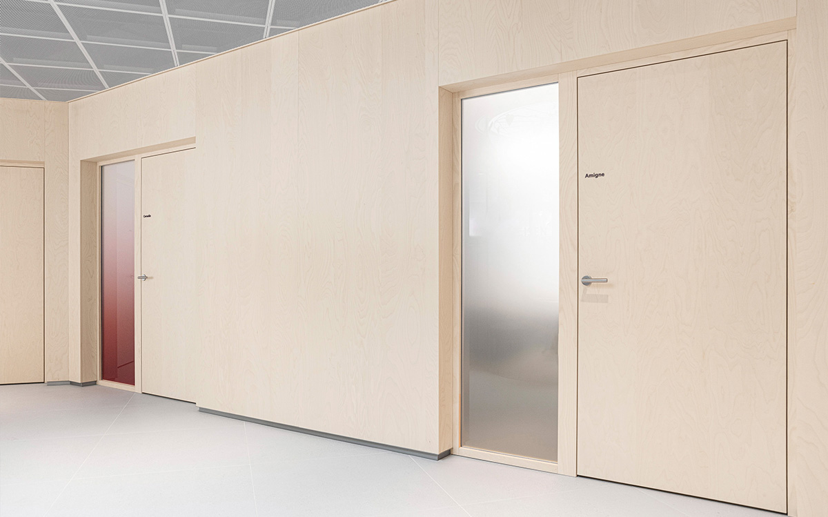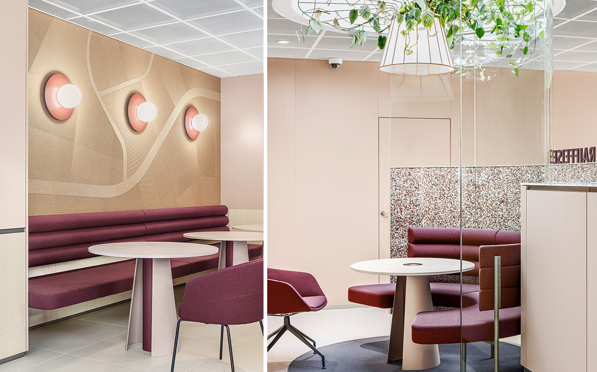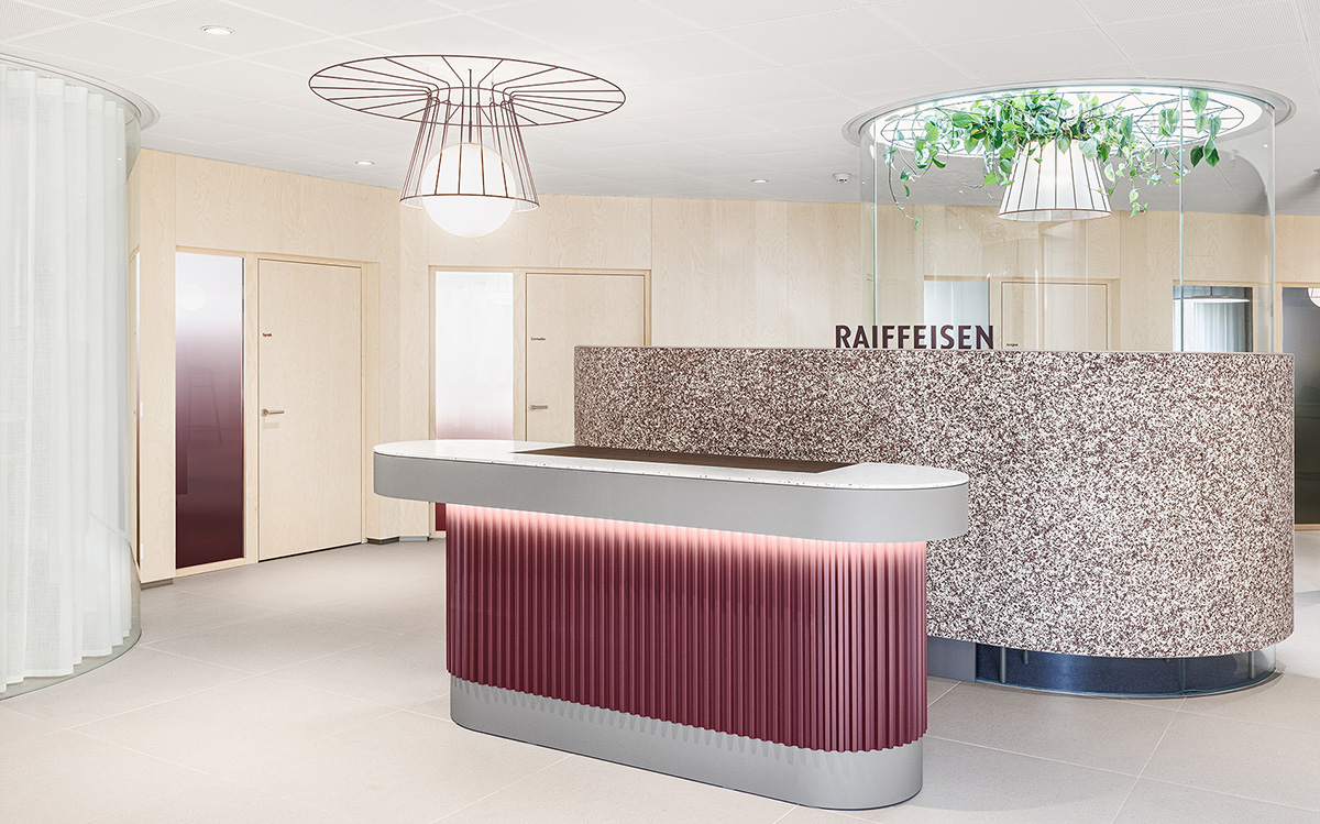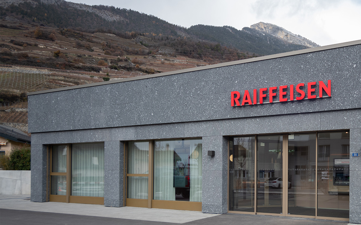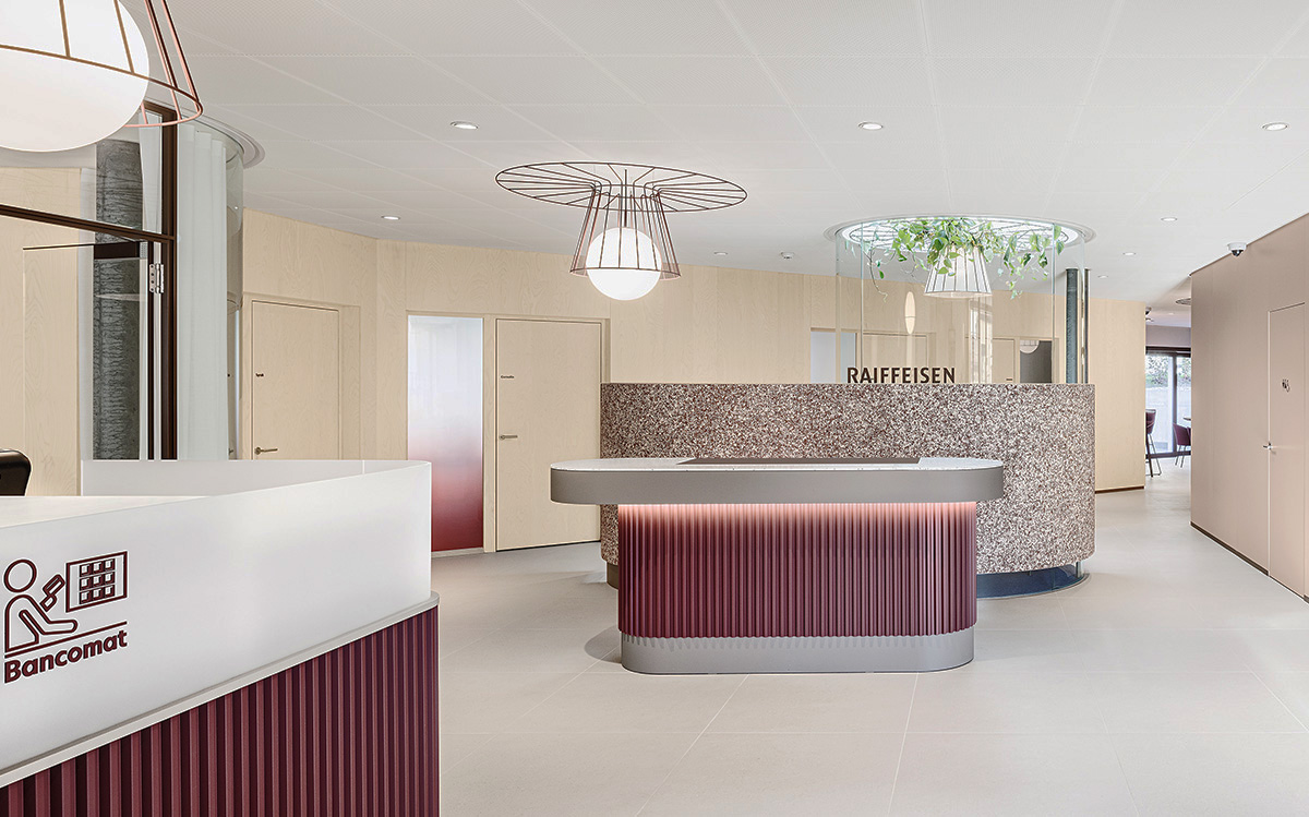 Die Gestaltungstypologie dient als Basis für künftige Geschäftsstellen, jeweils interpretiert nach regionalen Besonderheiten. Birkenholz schafft den Bezug zum Ort, die Farbpalette ist inspiriert von den lokalen Rebsorten Johannis, Amigne, Cornalin und Syrah.