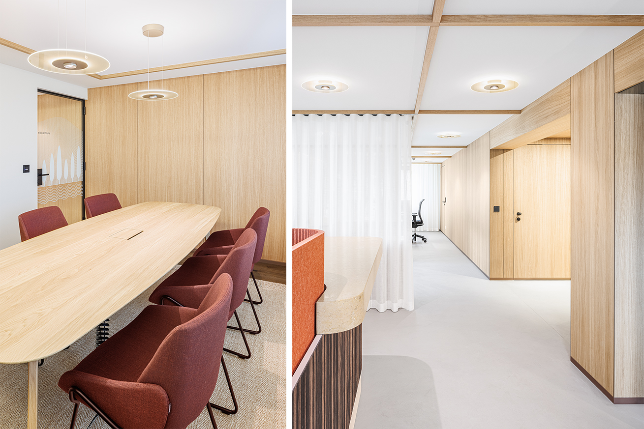 Der organisch geformte Empfangsdesk, die strukturierten Holzdecken mit integrierter Schallabsorption, die Leuchten mit subtilen Farbverläufen und die transparenten Beratungsbereiche sorgen für eine intuitive Orientierung und einen angenehmen, einladenden Empfang. Zusätzlich bietet die neue räumliche Organisation dem Team ein zeitgemässes, offenes und anregendes Arbeitsumfeld.