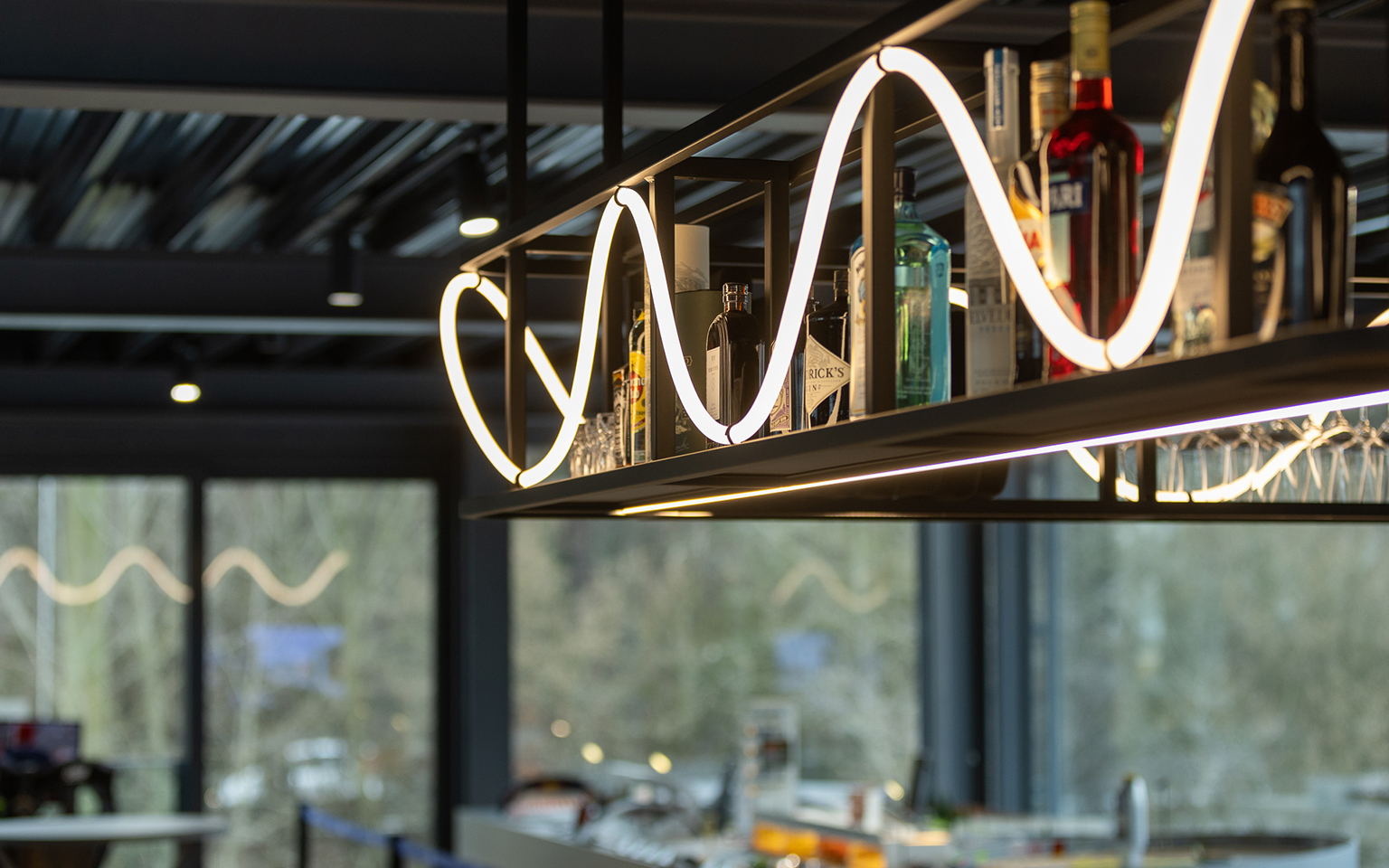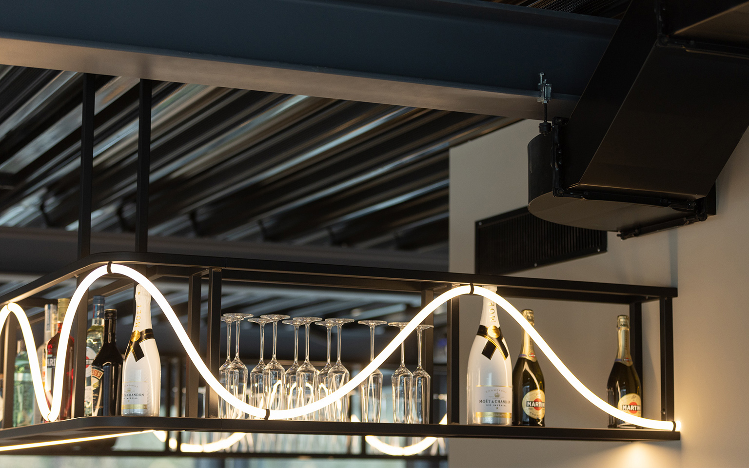 Die dynamische, fliessende Formensprache der Bar mit ihrer verspielten Beleuchtung und der freien Sicht auf die Rennstrecke lädt zur Erholung vom «digitalen» Adrenalinkick ein. Wir haben bei der Umsetzung der Formgebung und den Materialkombinationen — Holz, Holzwerkstoffe, Metall und Chromstahl – unser ganzes Können und Know-how einfliessen lassen. Um das Innenleben der Bar für die Mitarbeitenden der Kartbahn optimal zu gestalten, haben wir eng mit unserem Partner Soltis Küchen AG in Lyss zusammengearbeitet.