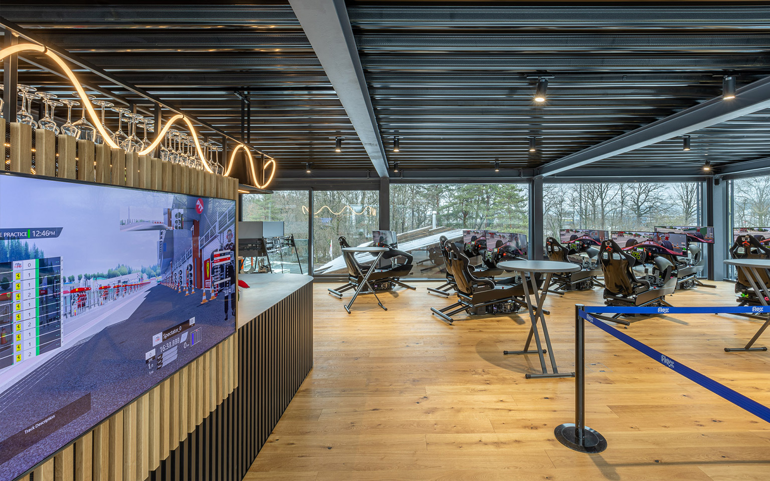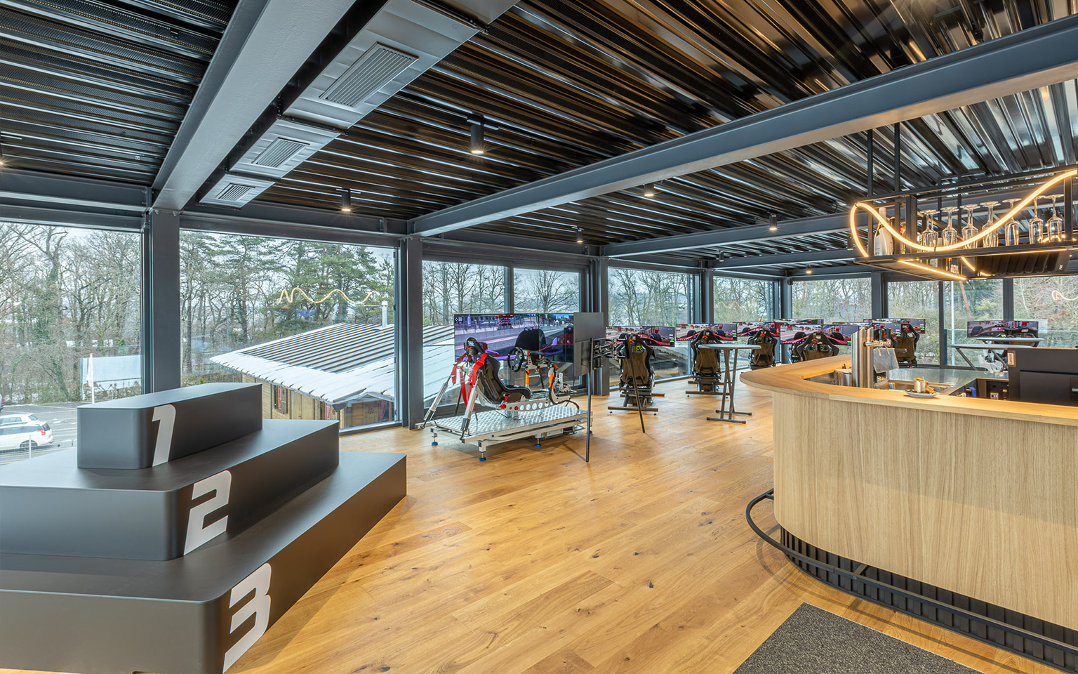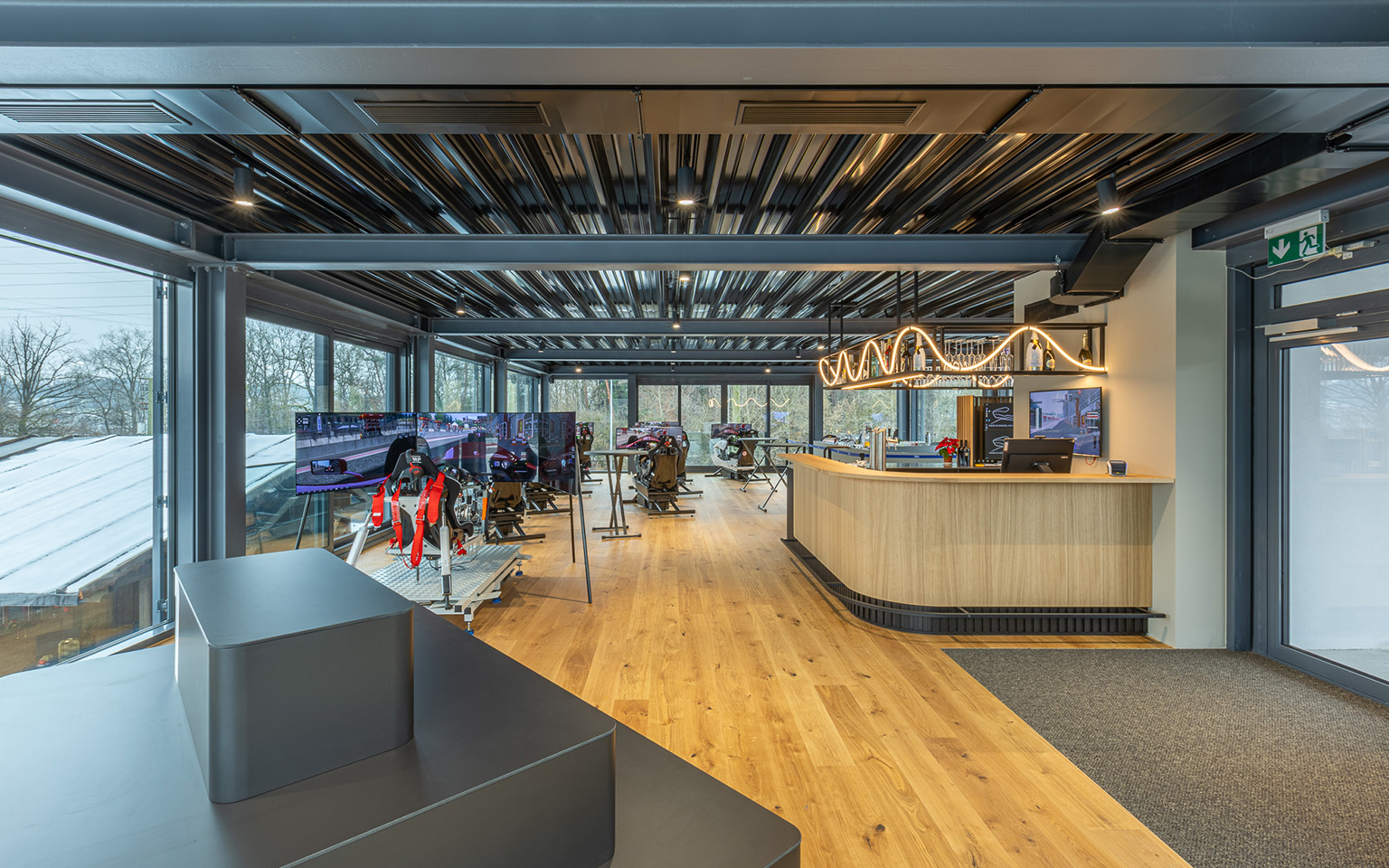 Gefragt war eine Neugestaltung für den offenen Raum mit den SIM-Simulatoren: Die neue Grundrissorganisation, die Bar als Blickfang und das Siegerpodest stammen aus der Feder von Gehri.