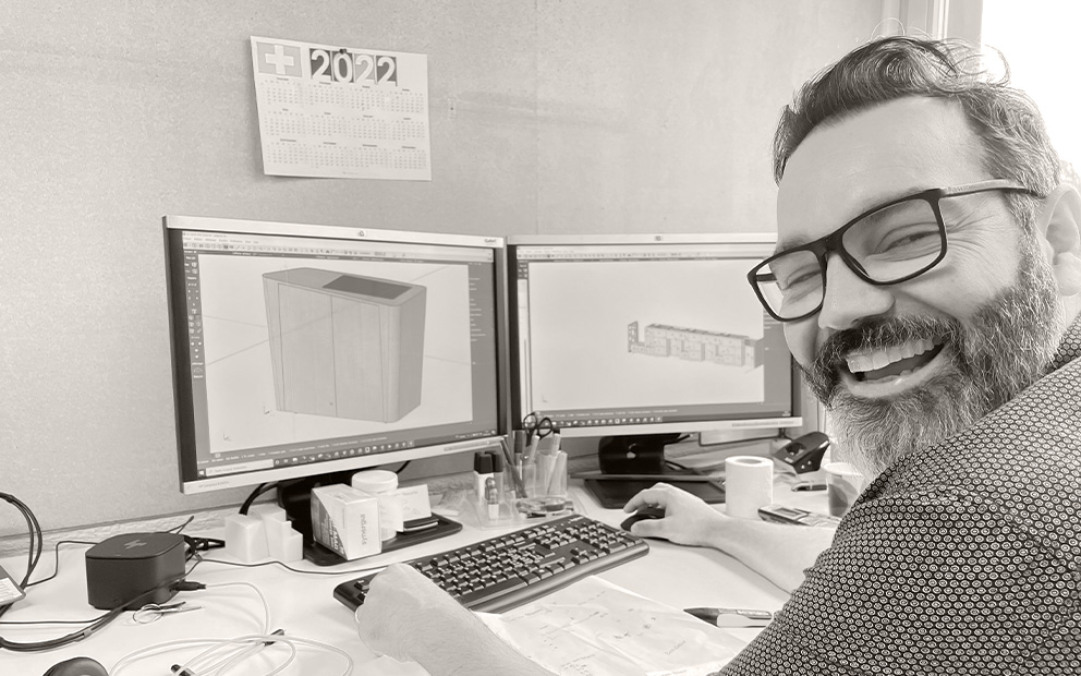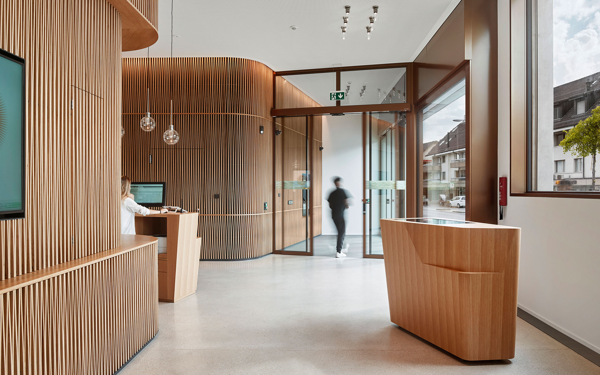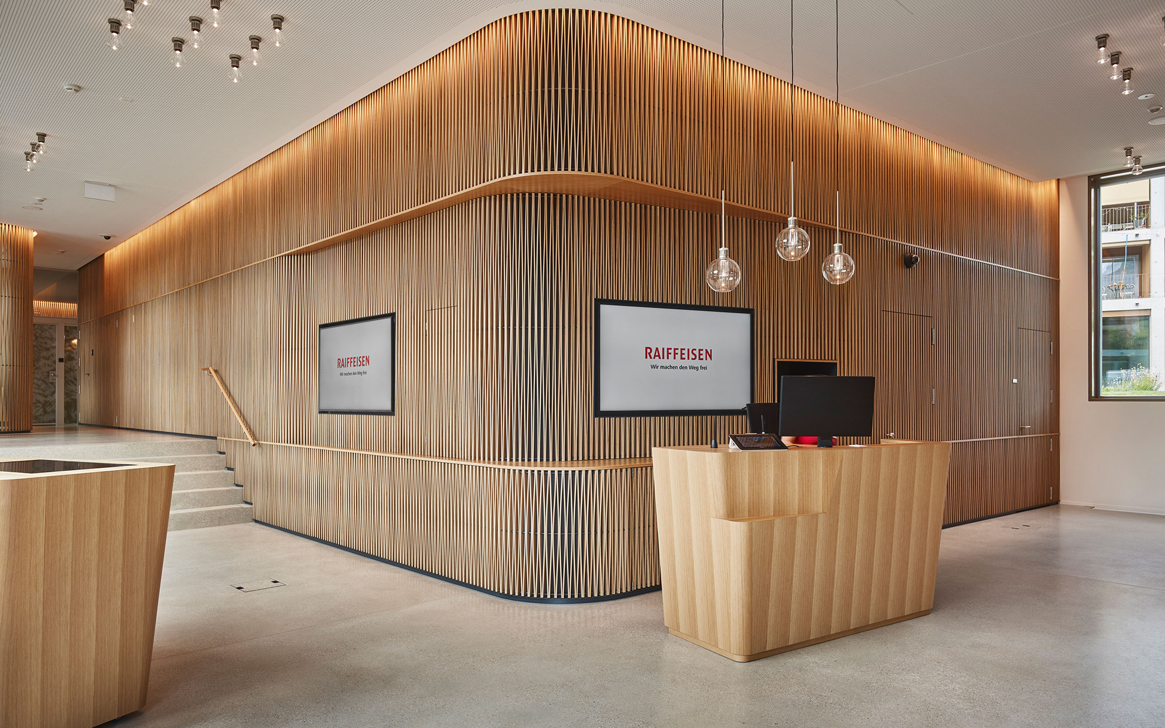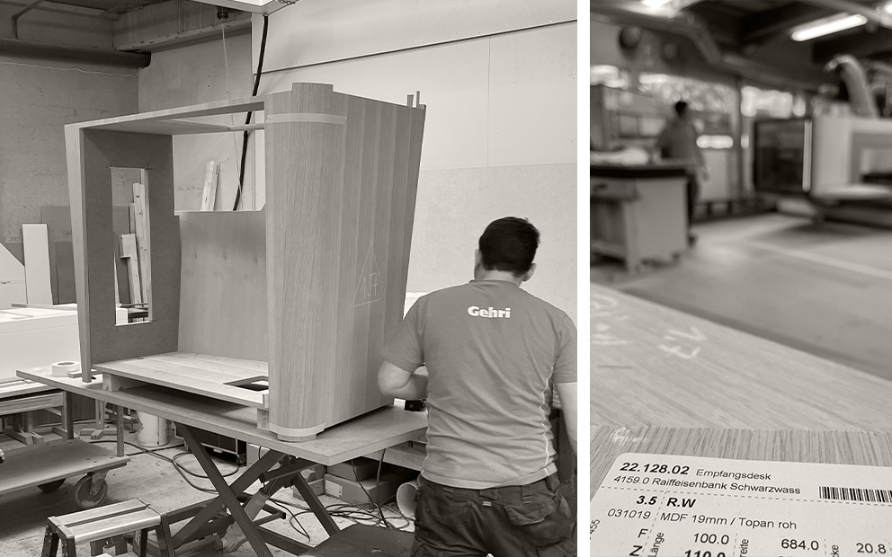 Auch der Empfangsdesk erforderte höchste fachliche Präzision in Bezug auf die Planung und Umsetzung der komplexen Formgebung — konisch, mit Rundungen und Radien — und der aufwendigen Furnierarbeiten. Die enge Zusammenarbeit während und nach der Beratungs- und Entwicklungsphase mit Rykart Architekten haben wir als ausgesprochen konstruktiv und angenehm erlebt.