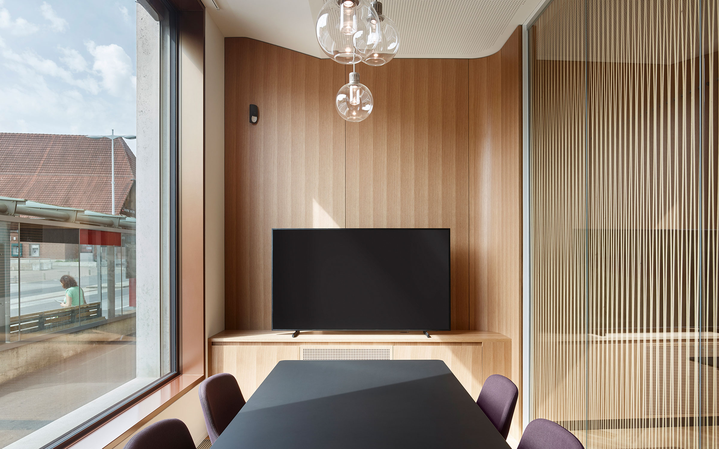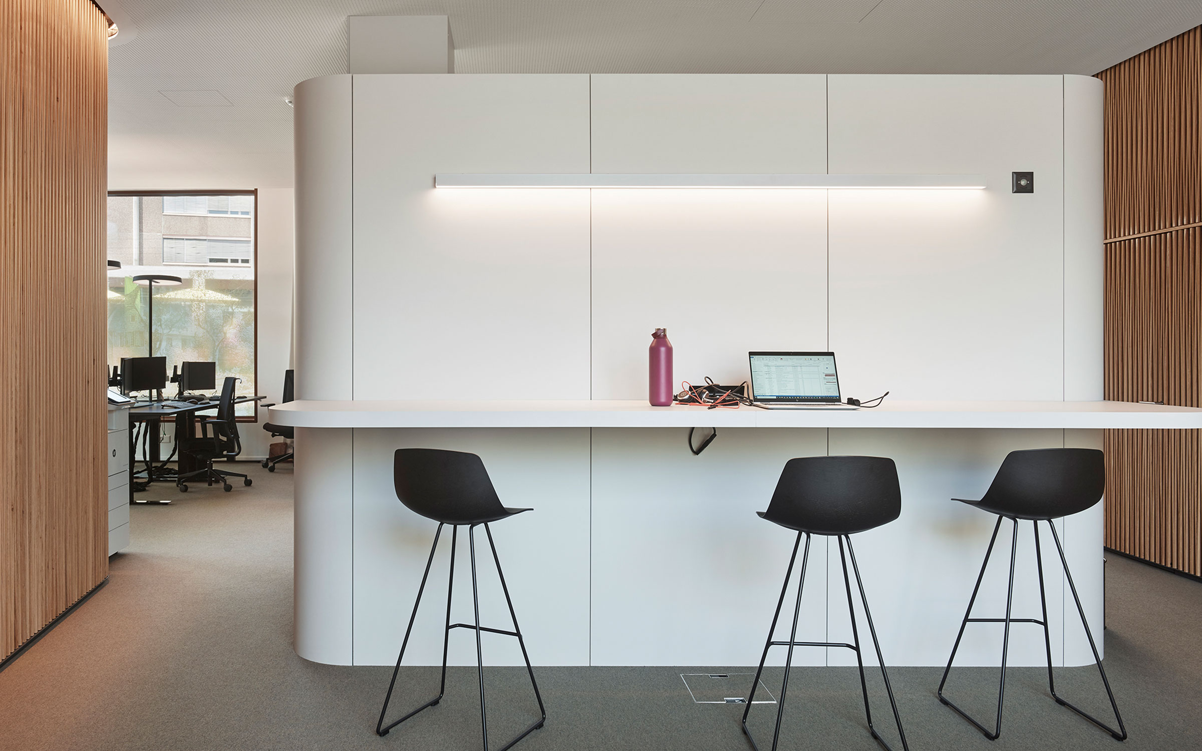 Die Fokusbox — eine dreiteilige Raum-in-Raum-Box — zeichnet sich durch gute Schalldämmung und magnetische Flächen aus; bei der Umsetzung galt es einige technische und konstruktive Herausforderungen zu meistern. Die Fokusbox bietet drei in sich geschlossene Räume für ruhiges, konzentriertes Arbeiten und diskrete Gespräche.