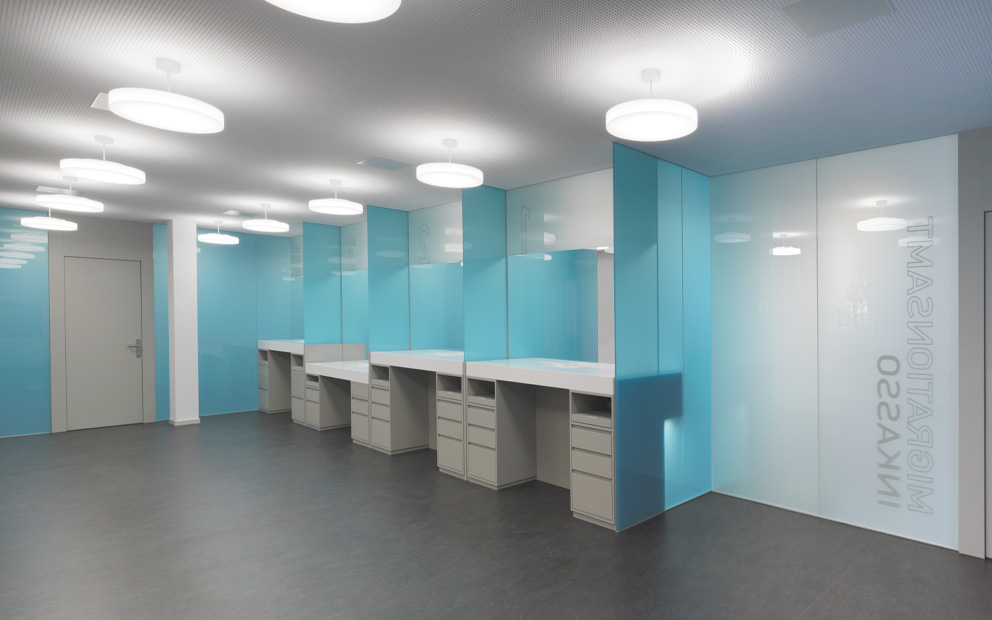 Die neuen Räumlichkeiten bestechen durch klare Linienführung, Leichtigkeit und eine gelungene Mischung aus Transparenz und Diskretion für die Beratung der Kundinnen und Kunden des Migrationsamts.