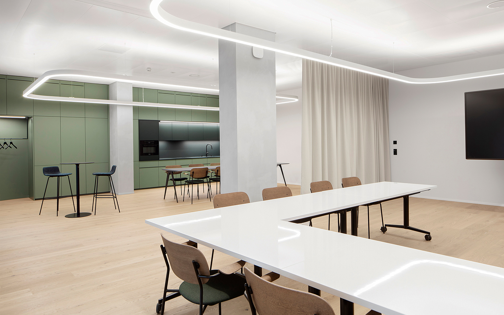 Die umfassende Renovierung am neuen Standort hatte auf der einen Seite eine verbesserte Zugänglichkeit, auf der anderen Seite die Integration nachhaltiger Technologien und energetischer Massnahmen zum Ziel. Zusätzlich sorgen grosszügige Fassadenöffnungen für mehr natürliches Licht. Das Beratungszentrum in Peseux profitiert von dieser neuen Raumqualität und heisst seine Kund*innen in einer ausgesprochen einladenden Umgebung willkommen. Die neuen Räumlichkeiten bieten nicht nur Platz für das fünfköpfige Team, sondern umfassen neu auch einen grossen Multifunktionsraum — das «Forum» —, der z. B. für Kundenveranstaltungen oder Mitarbeiterschulungen genutzt werden kann. Die flexible Ausstattung ermöglicht eine schnelle, einfache Umgestaltung des Raums — je nach Bedarf.