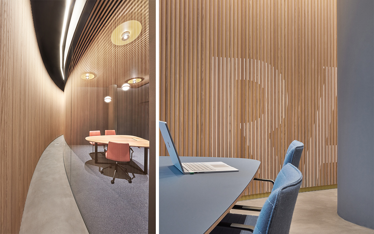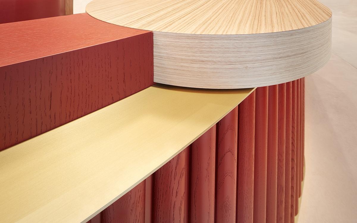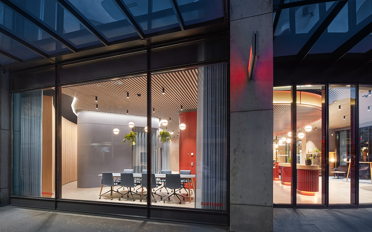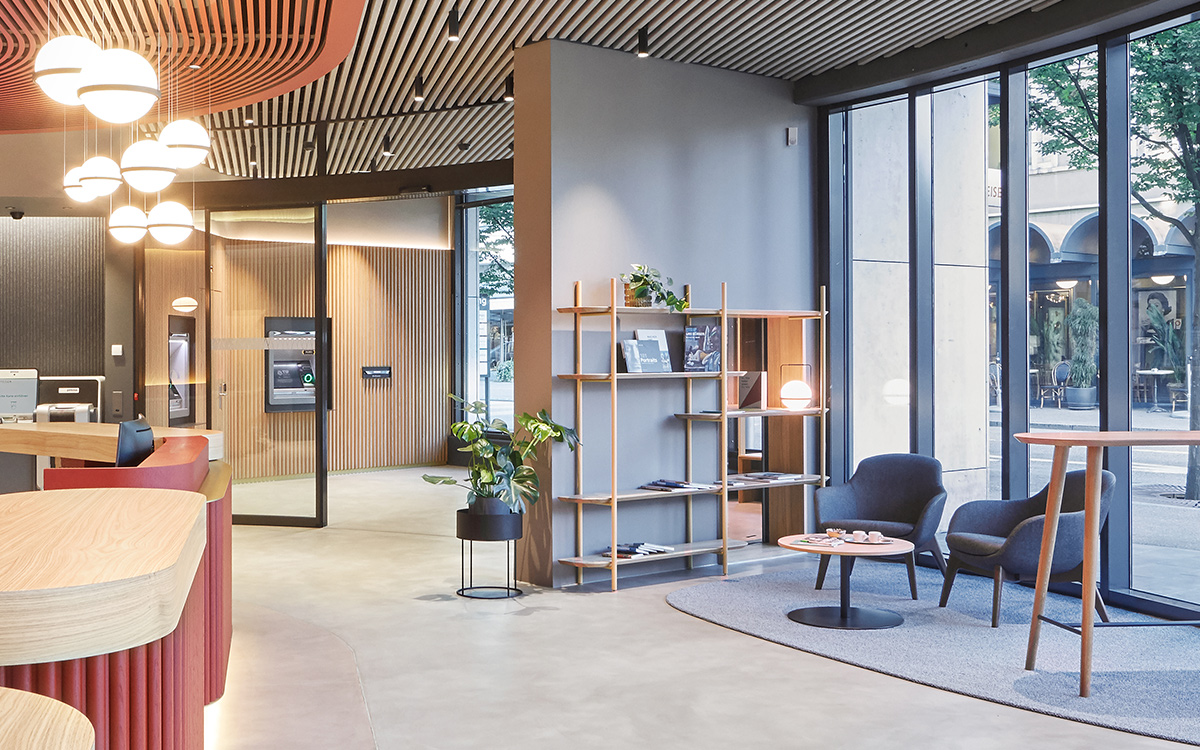 Anders als der frühere Aufbau des Innenraums gestaltet sich das neue Raumkonzept in umgekehrter Komposition und stellt den Kundenkontakt ins Zentrum des Geschehens — das Servicekonzept baut sich vom Herzen der Kundenhalle nach aussen hin auf und repräsentiert die persönliche Beziehung zur Kundschaft. Die Gastgeberfunktion der Mitarbeitenden steht nun sprichwörtlich im Zentrum.