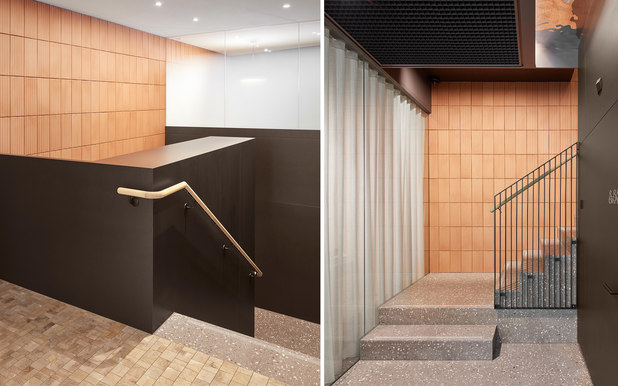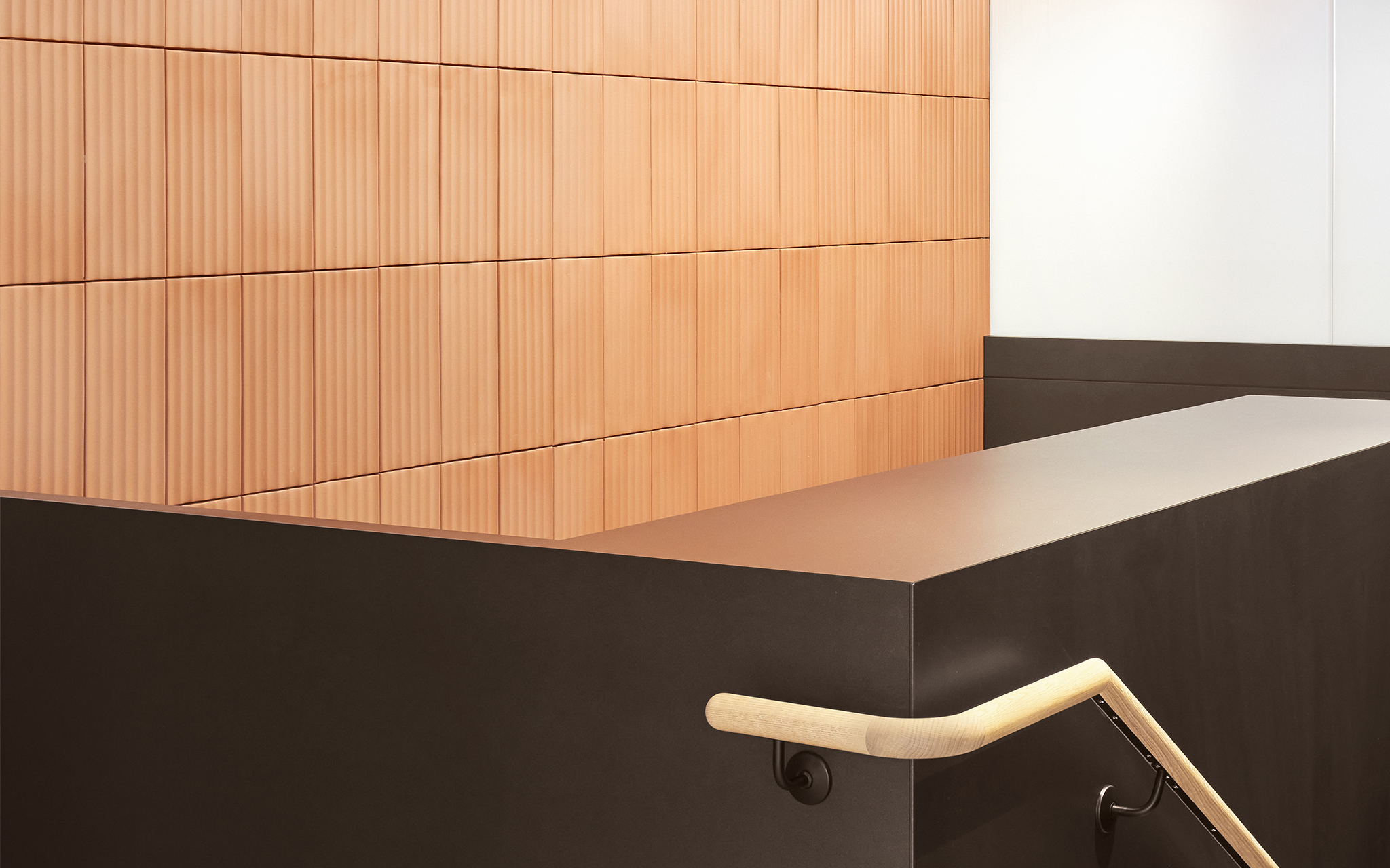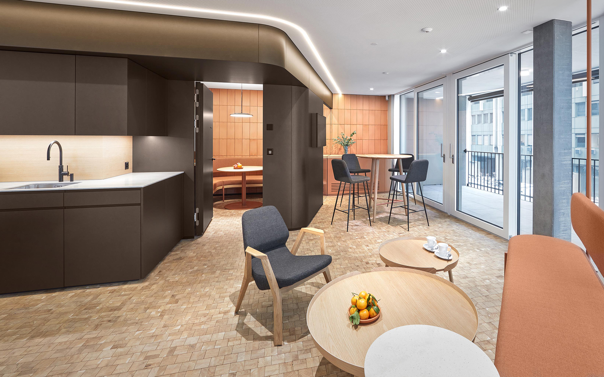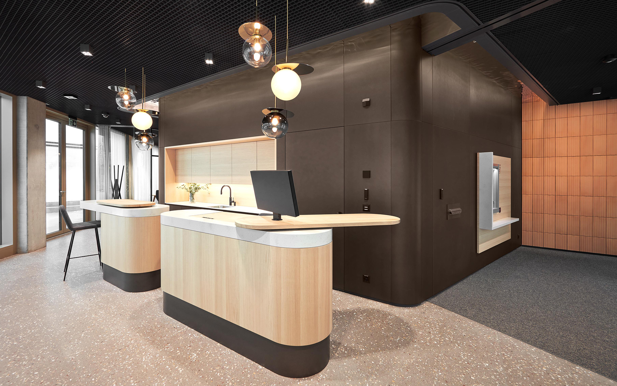Die im vorderen Teil des Gebäudes platzierte Bank umfasst zwei Etagen. Die Herausforderung bestand darin, alle Anforderungen auf einer möglichst kompakten Fläche unterzubringen, ohne dass der Raum an Klarheit und Selbstverständnis verliert. Neben der 24-Stunden-Zone und dem Kundenbereich mit diskreten Beratungsmöglichkeiten im Erdgeschoss findet man im 2. Stock einen diskreteren Bereich mit Teamoffice, einen Kaffeebereich mit Balkon sowie verschiedene Beratungsräume.