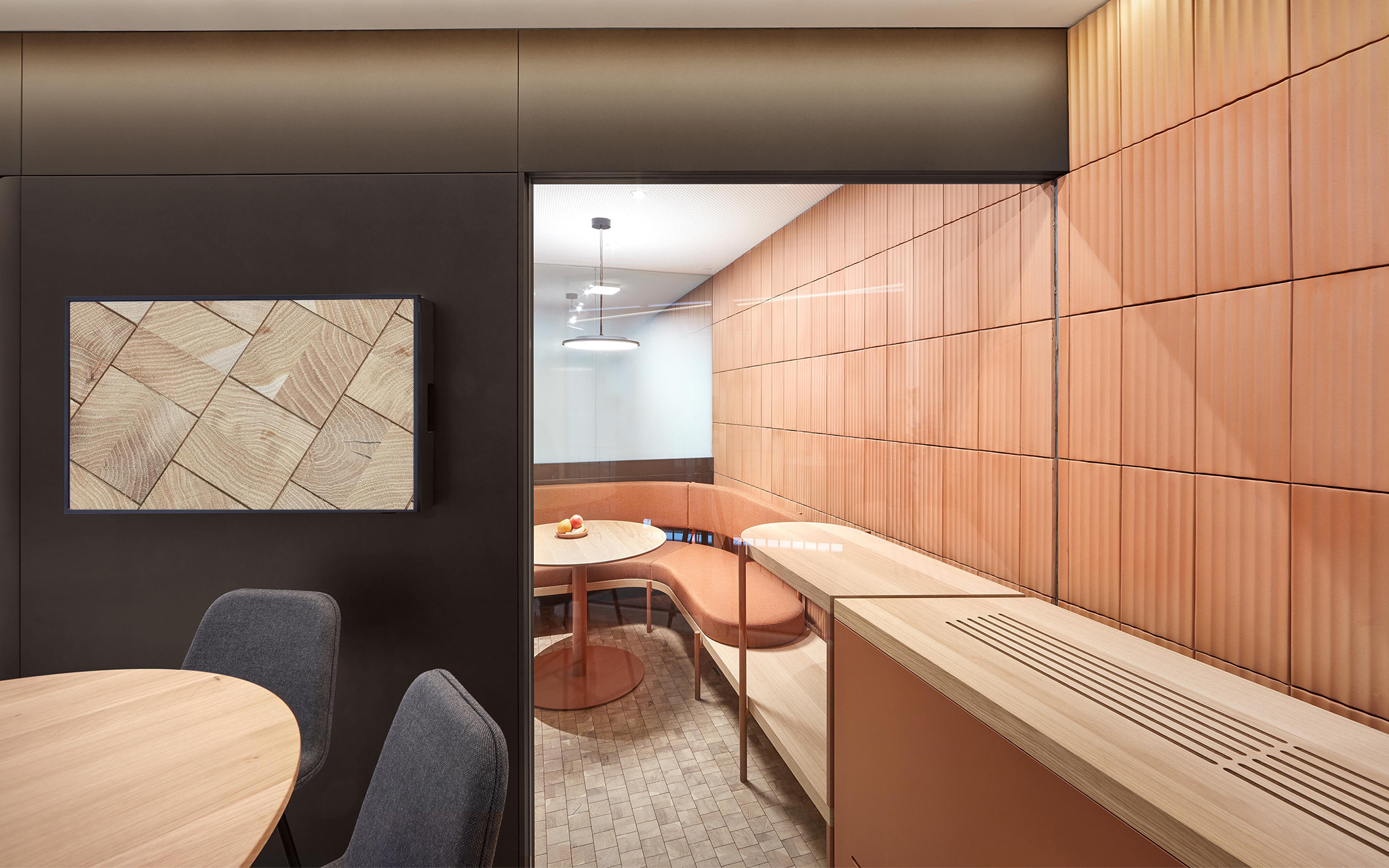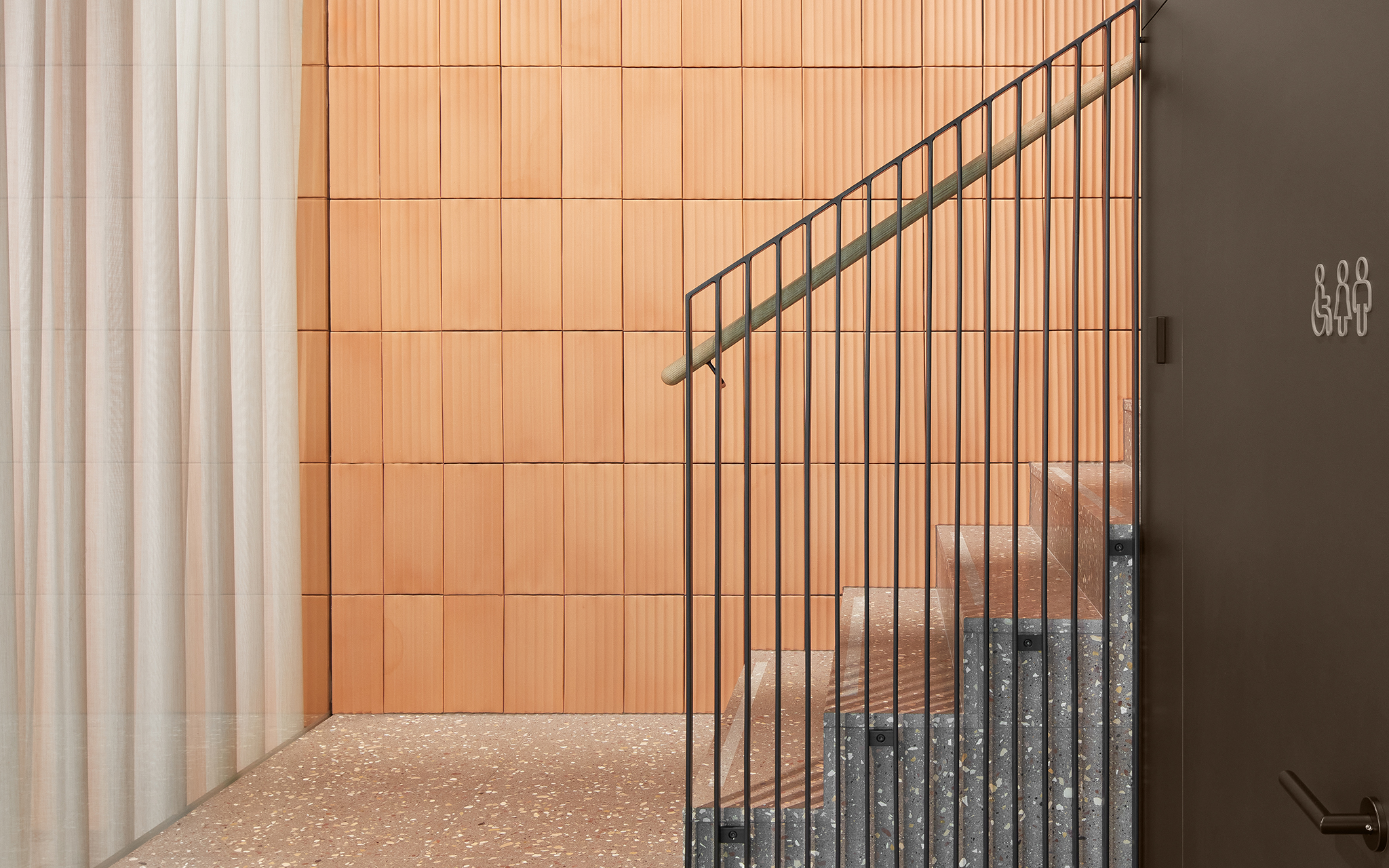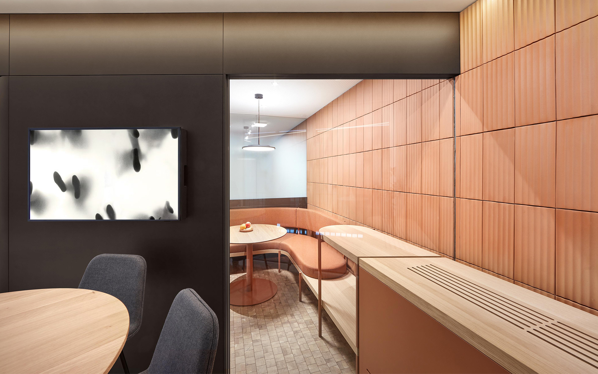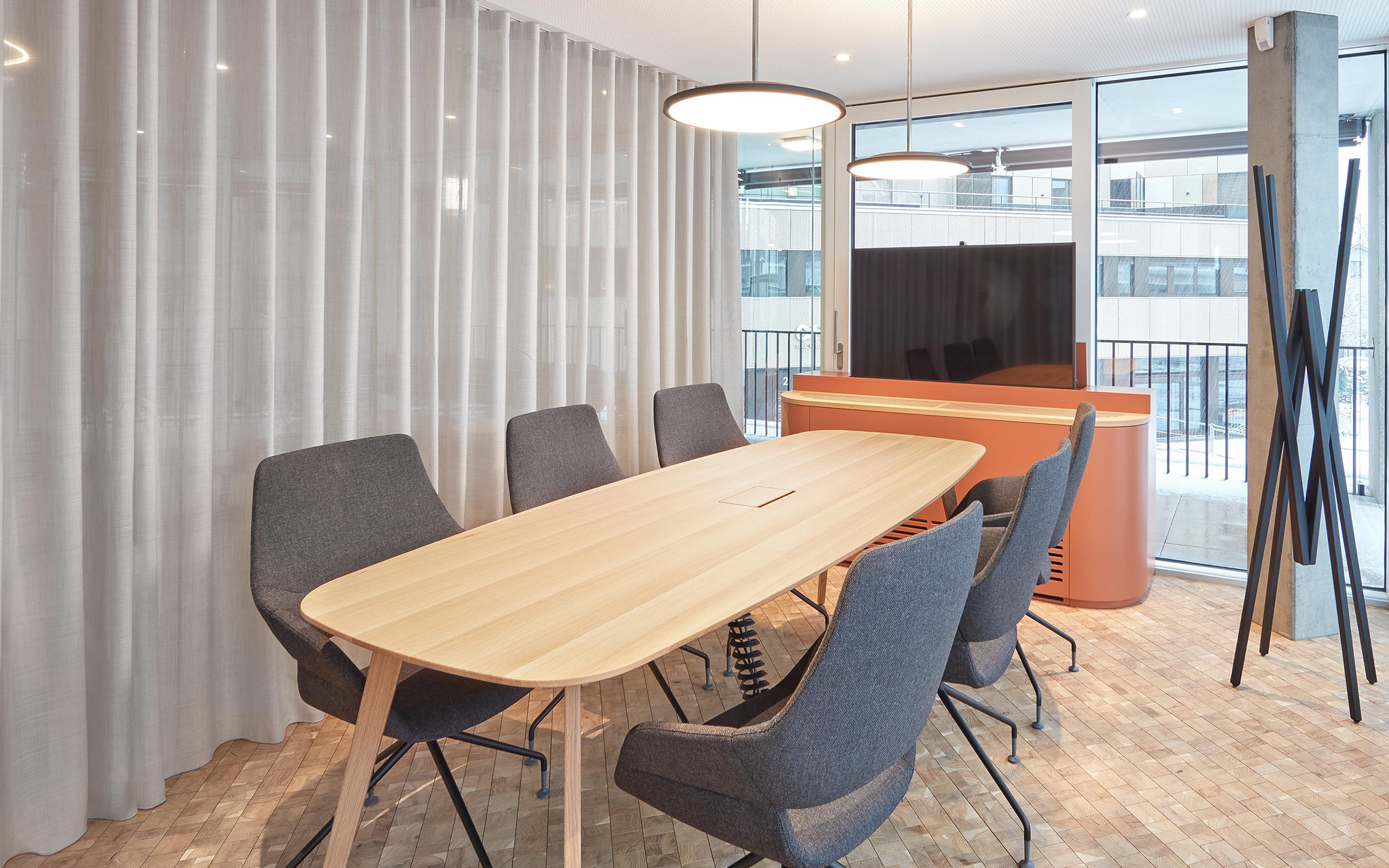 Die im vorderen Teil des Gebäudes platzierte Bank umfasst zwei Etagen. Die Herausforderung bestand darin, alle Anforderungen auf einer möglichst kompakten Fläche unterzubringen, ohne dass der Raum an Klarheit und Selbstverständnis verliert. Neben der 24-Stunden-Zone und dem Kundenbereich mit diskreten Beratungsmöglichkeiten im Erdgeschoss findet man im 2. Stock einen diskreteren Bereich mit Teamoffice, einen Kaffeebereich mit Balkon sowie verschiedene Beratungsräume.