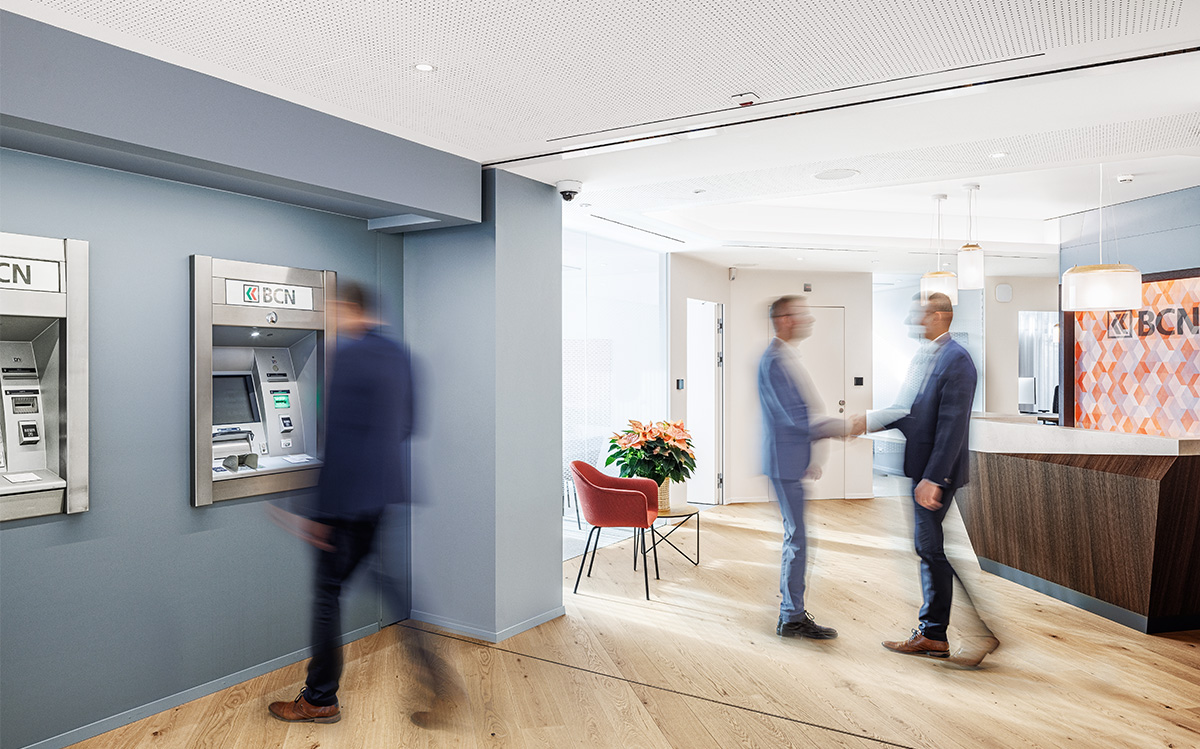 Die Sanierung der Kundenzone in Le Landeron schafft eine hohe Nutzungs- und Raumqualität: moderne Haustechnik, neue Fenster und eine klare Lichtführung verbessern Komfort und Orientierung. Geschlossene, transparent gestaltete Beratungsbüros sowie die erweiterte 24h-Zone mit Autosafe stärken Kundenerlebnis und Arbeitsumfeld.